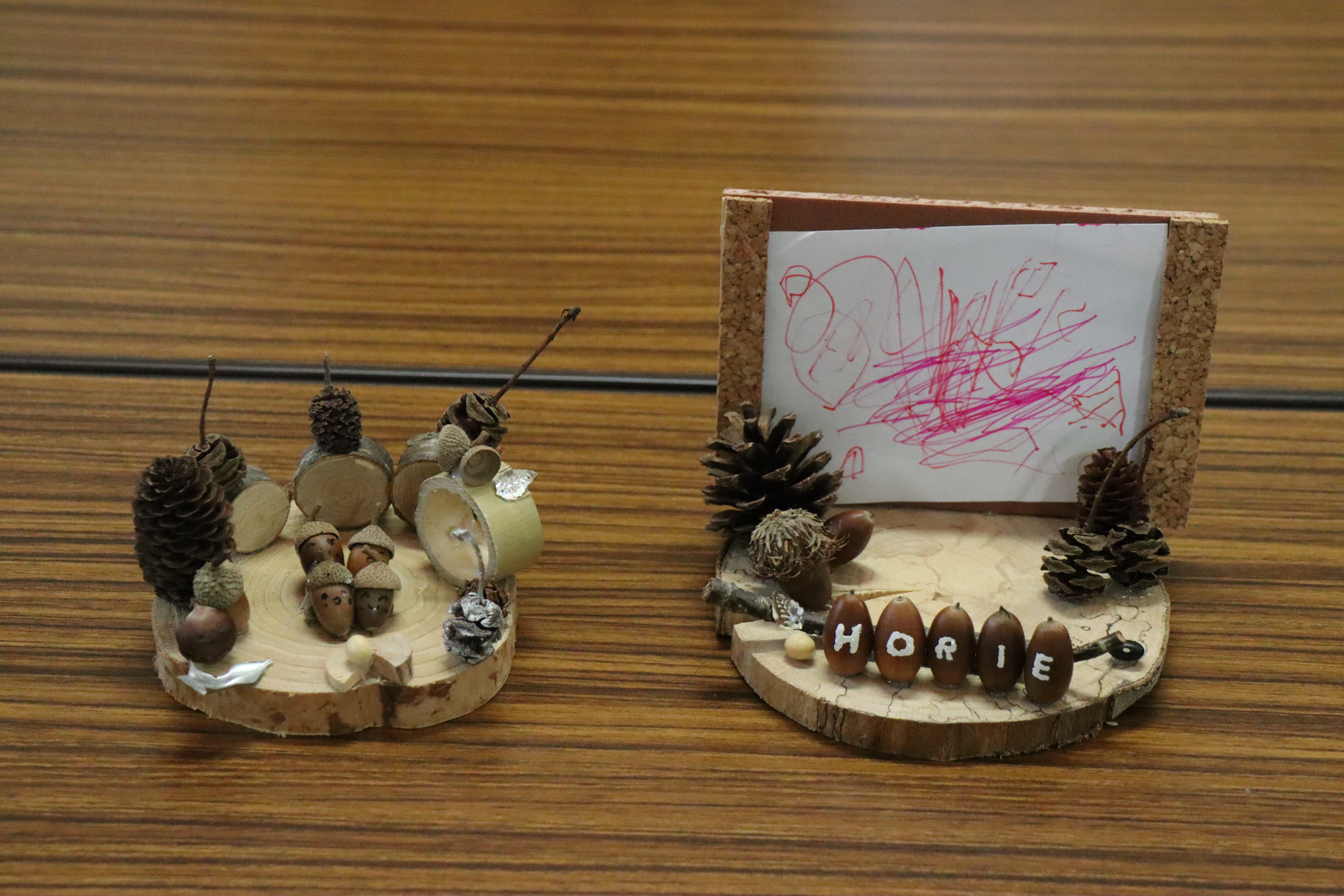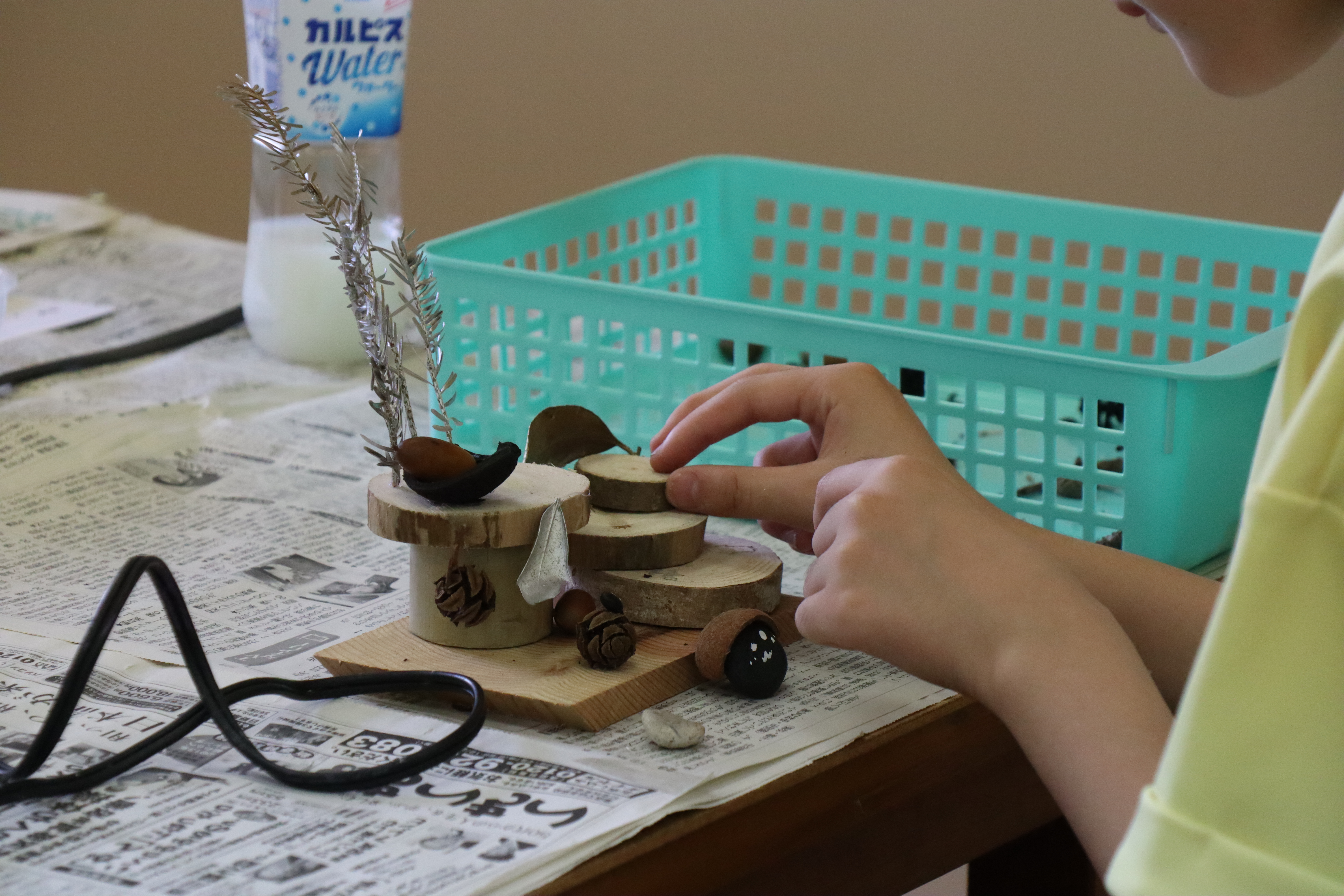 主にグルーガンの使い方、注意点などの説明の後、環境と文化のむらの敷地内で採取された自然素材を使い、各自思い思いの作品を作りました。