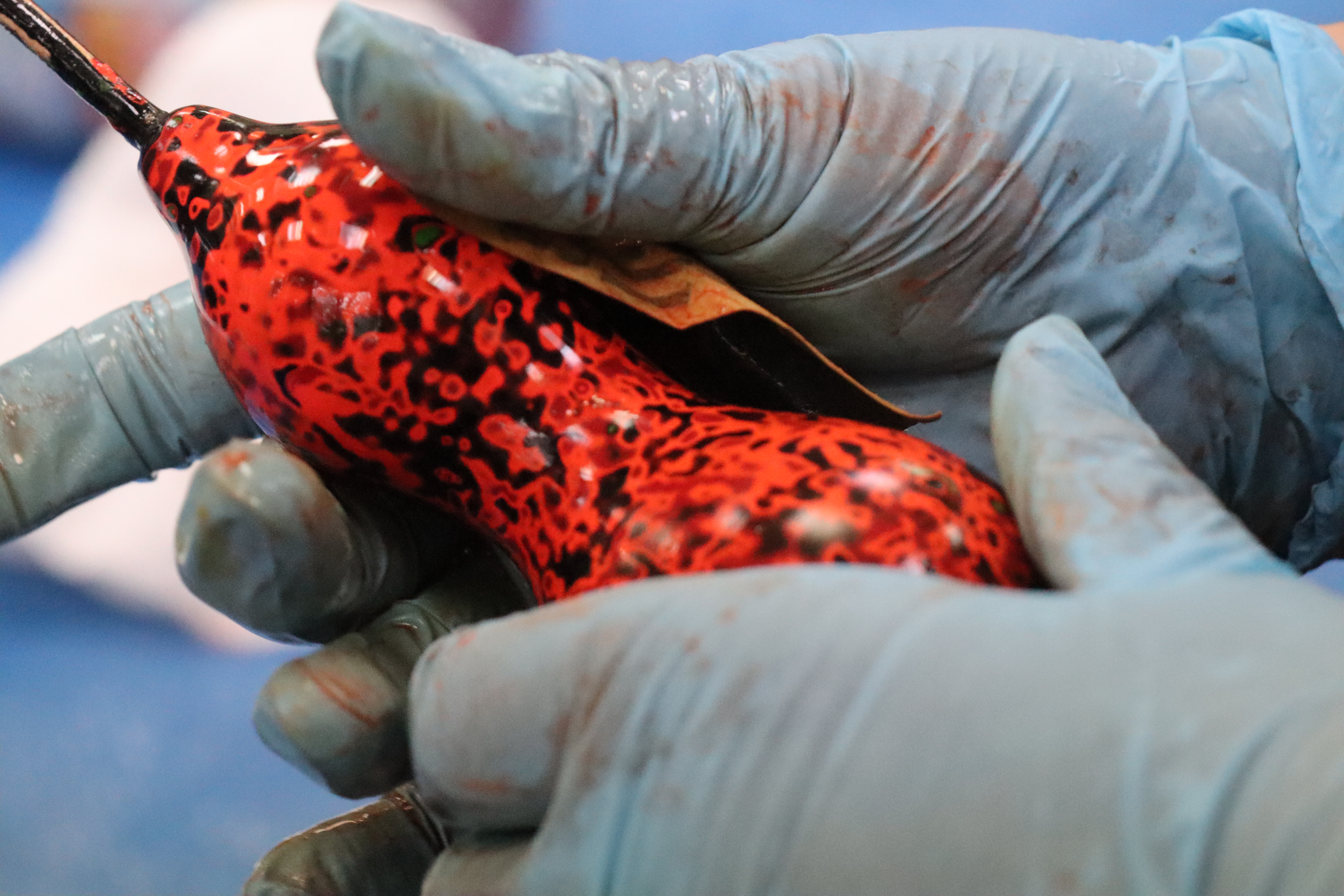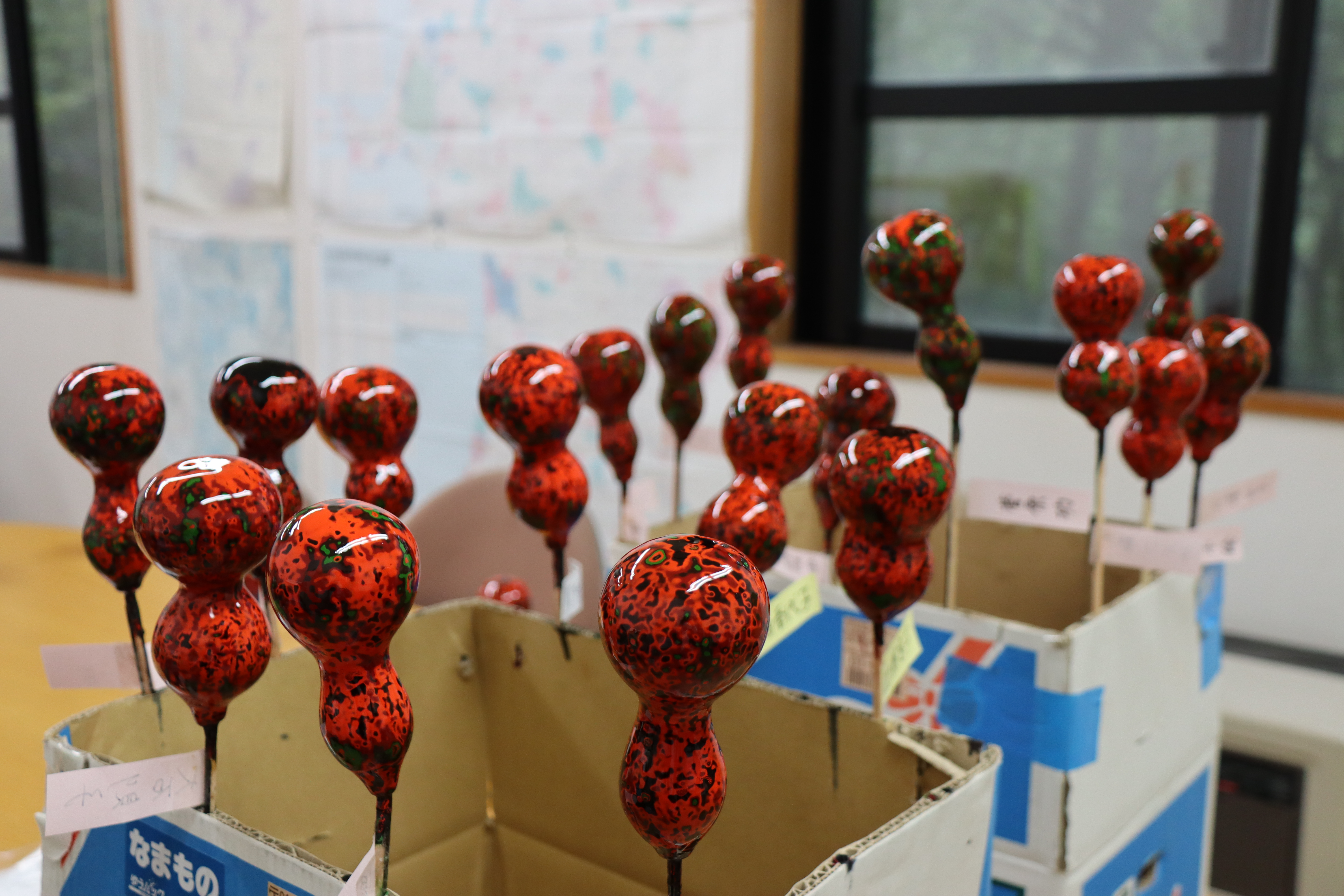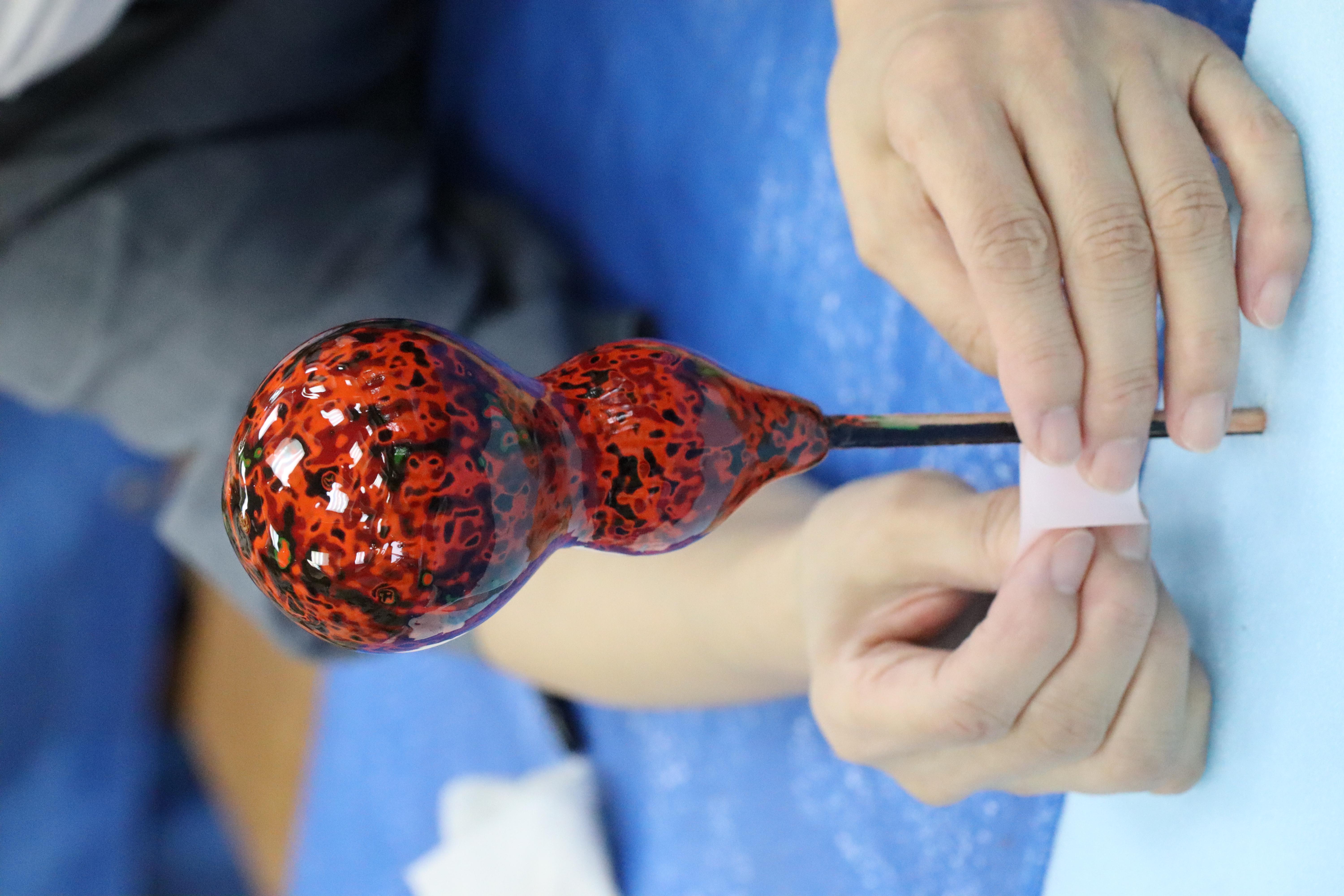 まず、ヒョウタンの飾りづくりの準備にどれほどの時間と労力が費やされたか話を聞き、それから制作に取り掛かりました。何層にも色が塗り重ねられたヒョウタンを、水を付けながらサンドペーパーで研いでいきます。約1時間以上かけて気に入った模様になったところでニスを塗り、乾燥させます。乾燥に1週間ほど掛かるので、日を改めて受け取りに来ることになりました。
