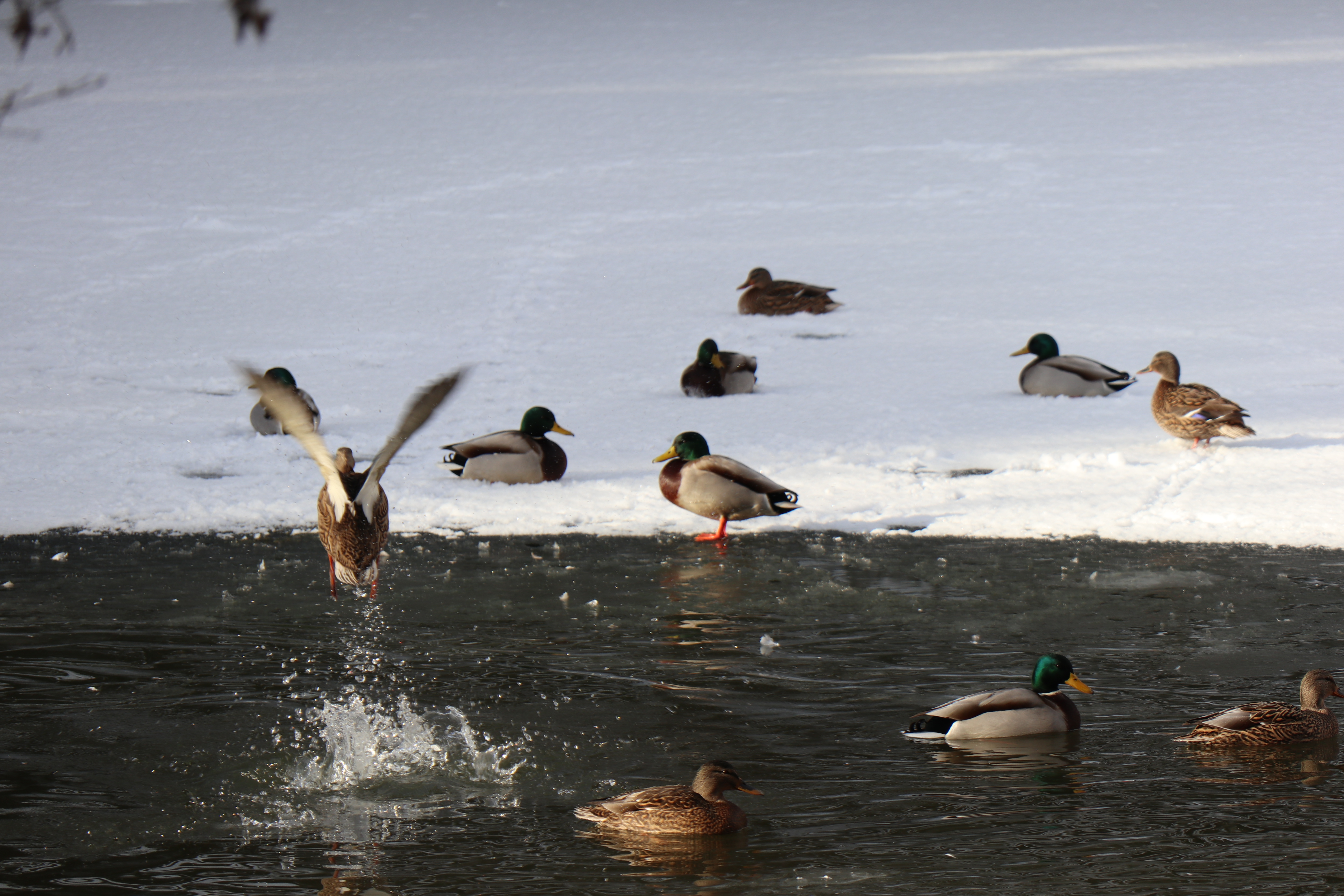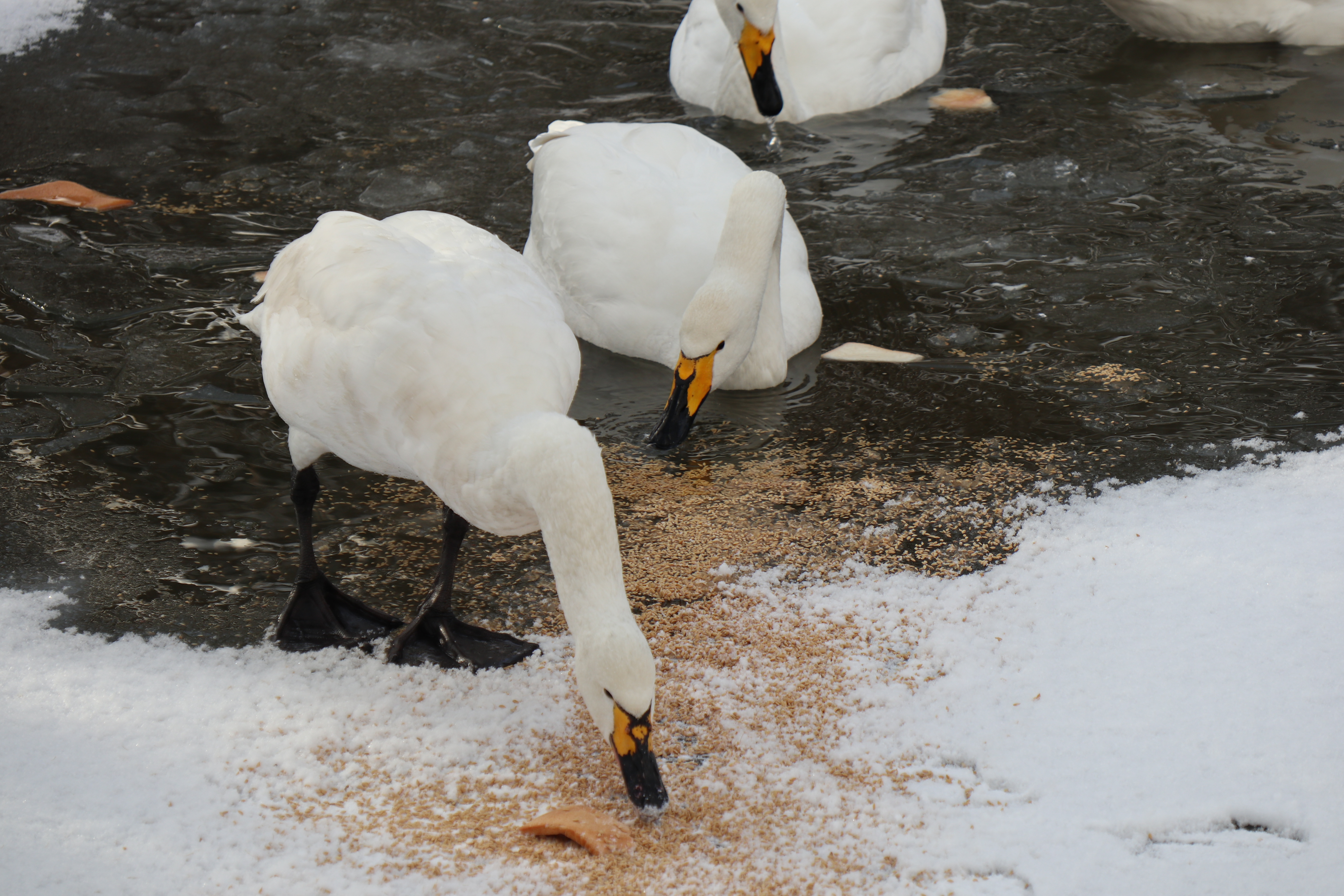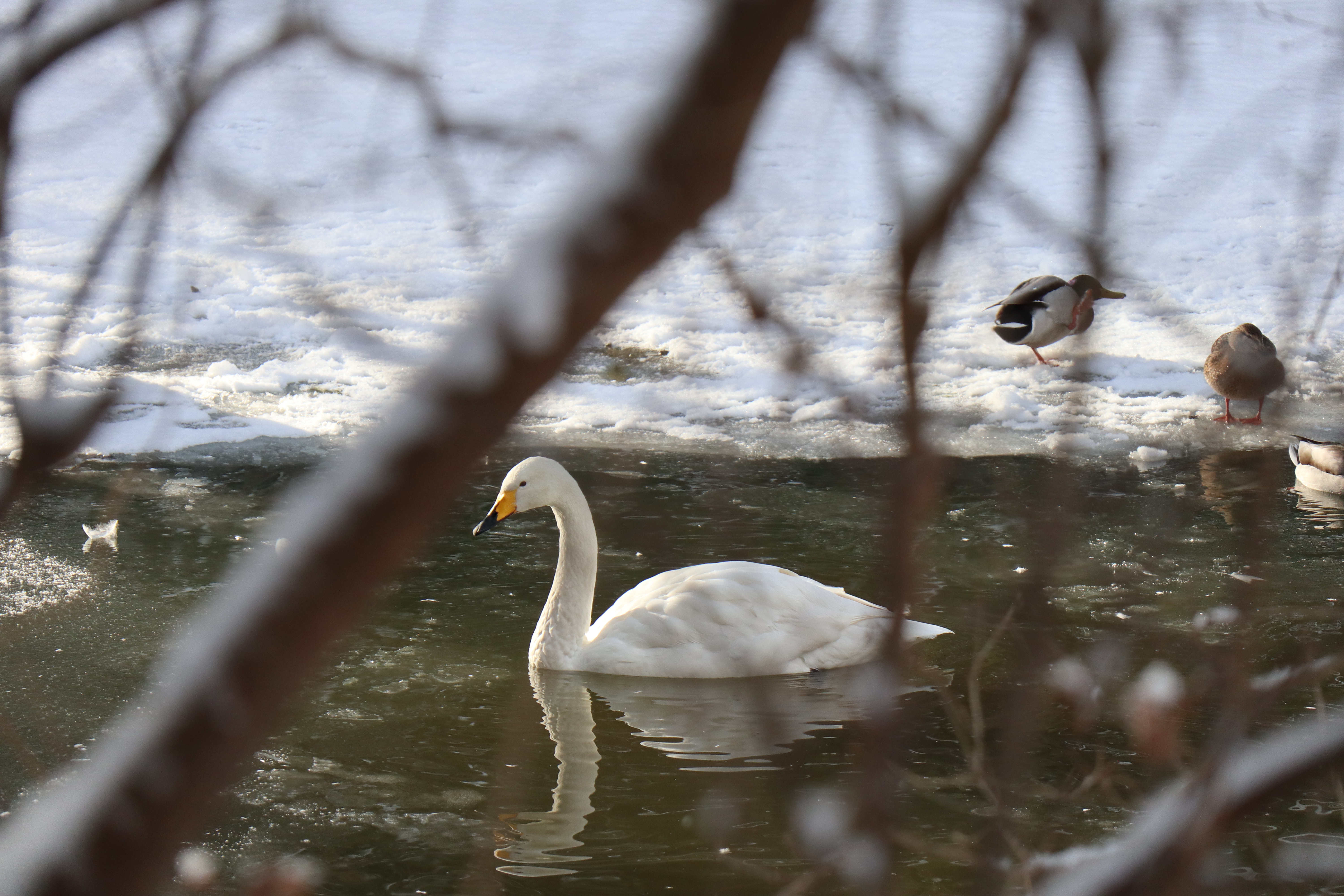 今日は冬の晴れ間。水鳥池は大部分が氷で覆われていましたが、凍っていない部分には、白鳥やカモがのんびりと泳いでいました。ちょうど餌の時刻で、鳥たちが餌をついばむ姿を見ることができました。明日からの吹雪をどうやって乗り越えるのでしょう?また穏やかな天気になりましたら、鳥たちに会いに行きたいと思わせる、美しい鳥たちでした。