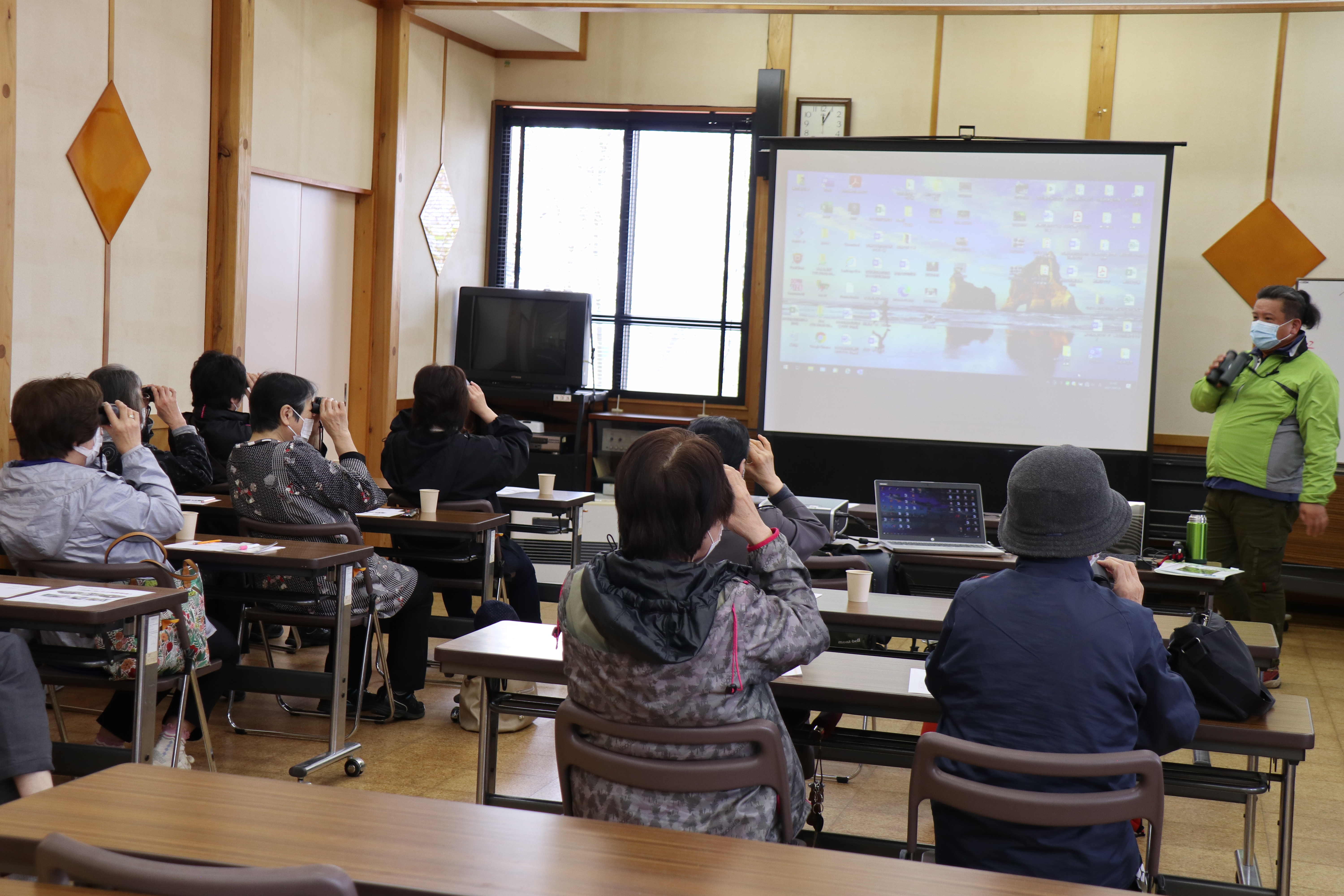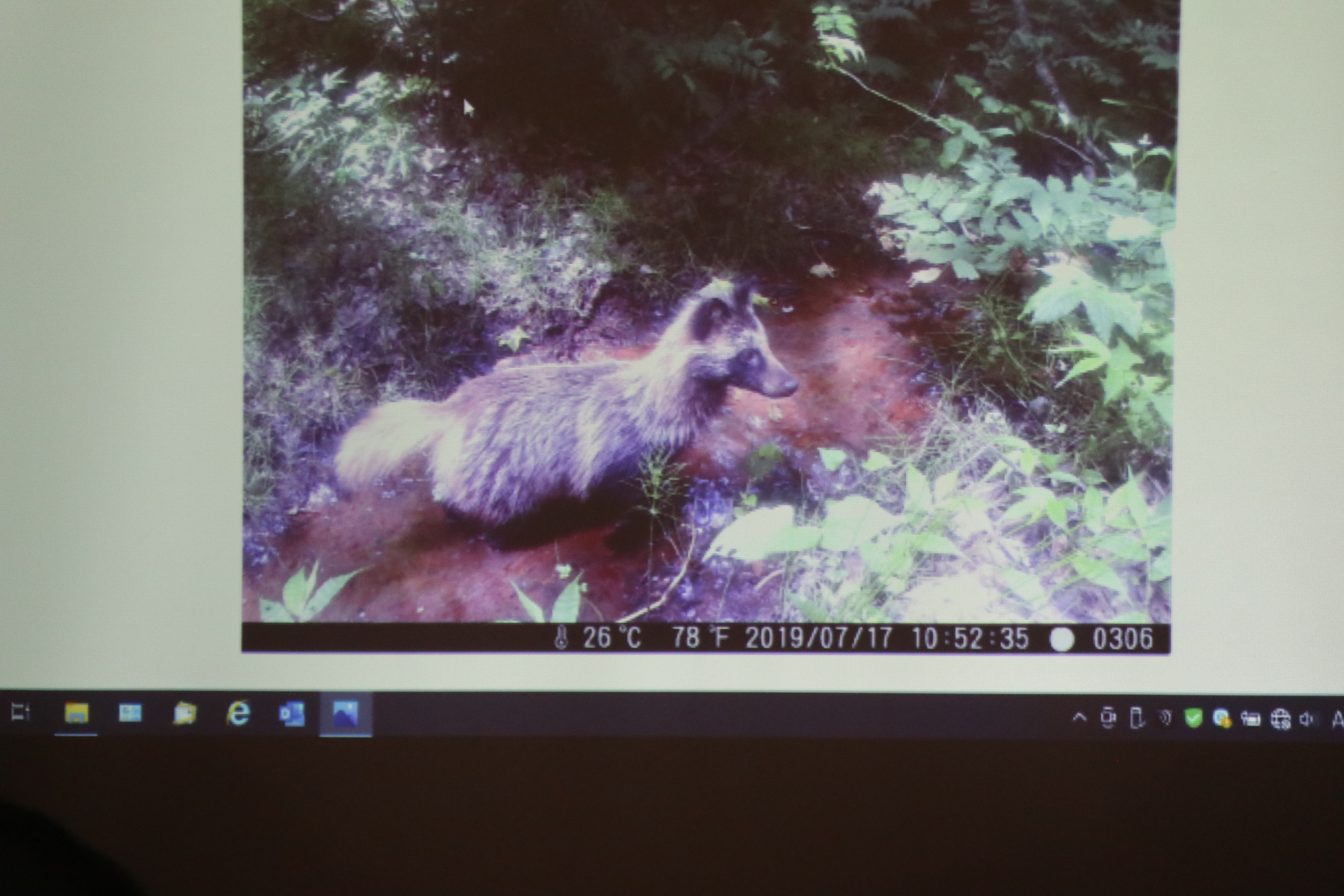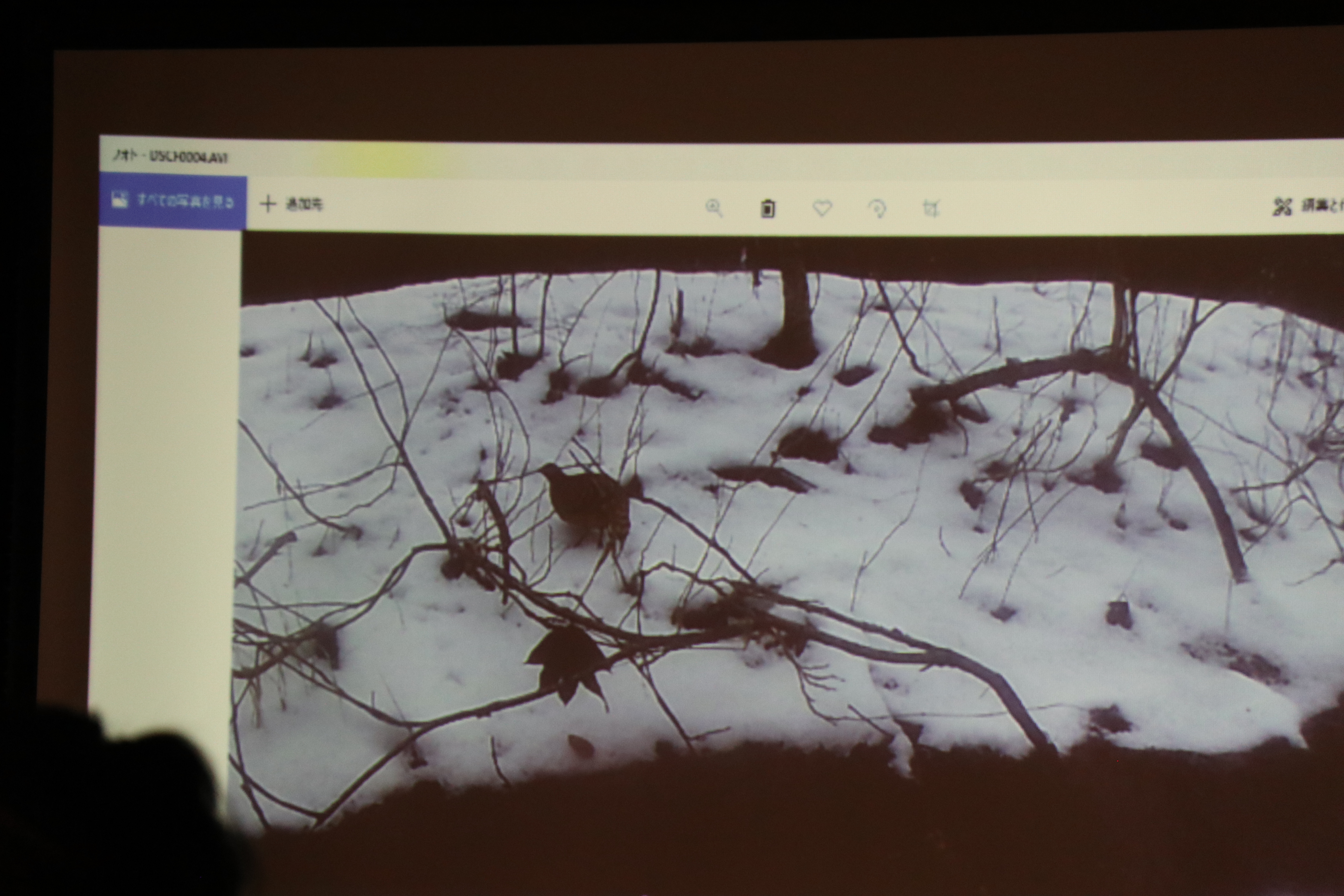 当日はあいにくの小雨で野外観察には出られなかったため、足利氏が設置している定点カメラの静止画や動画を見ながら、「五城目野鳥の森」の野鳥や動物の話を伺いました。