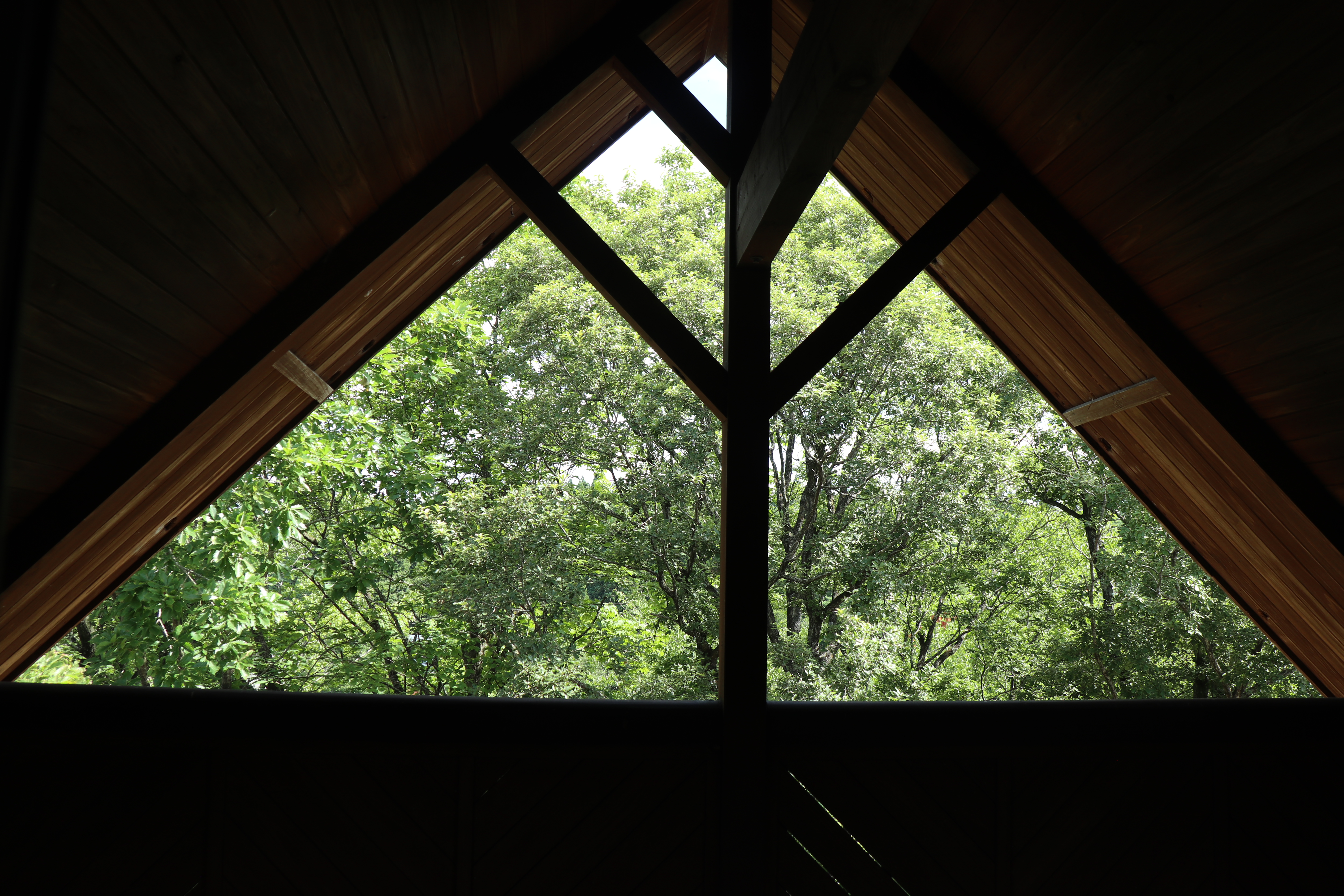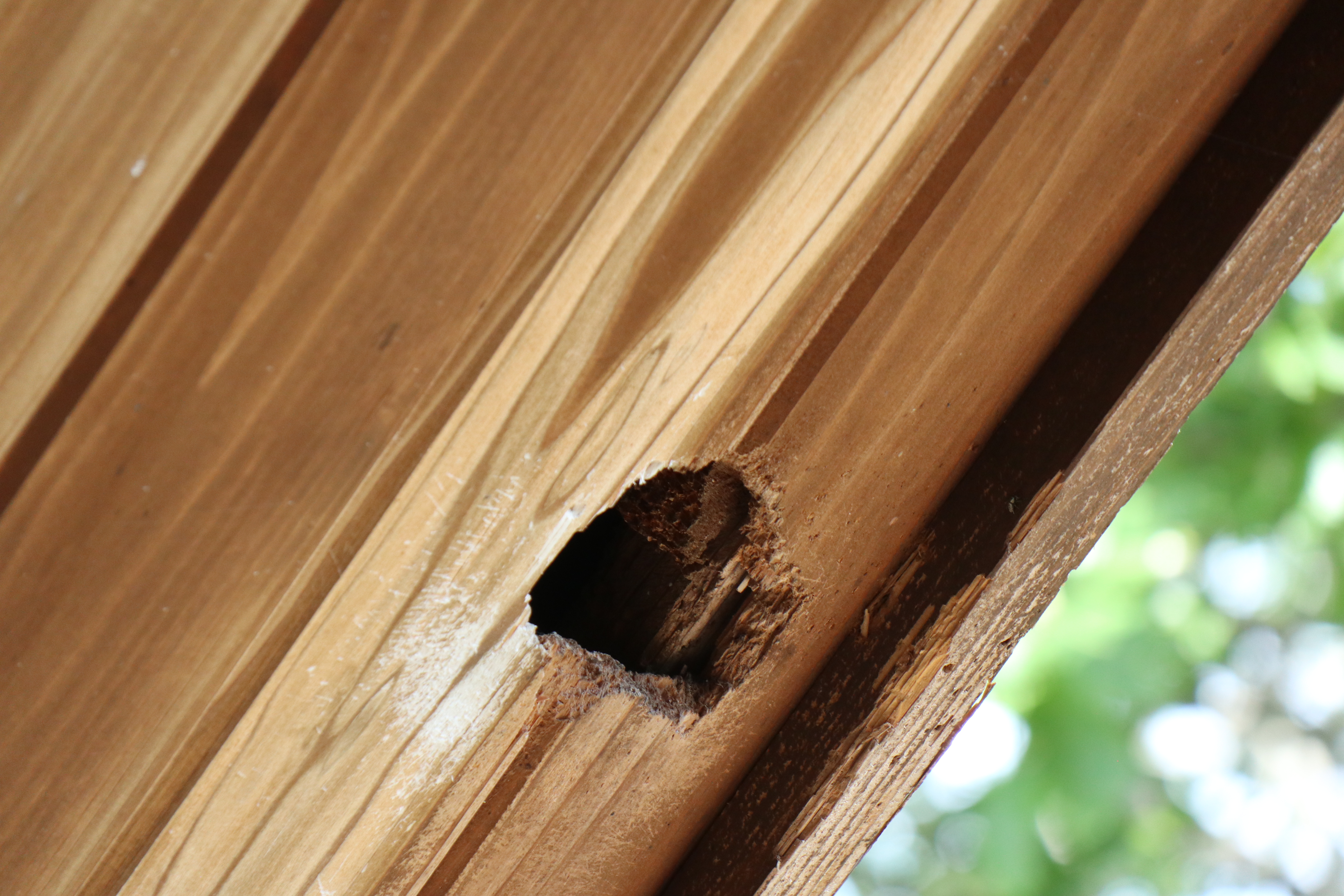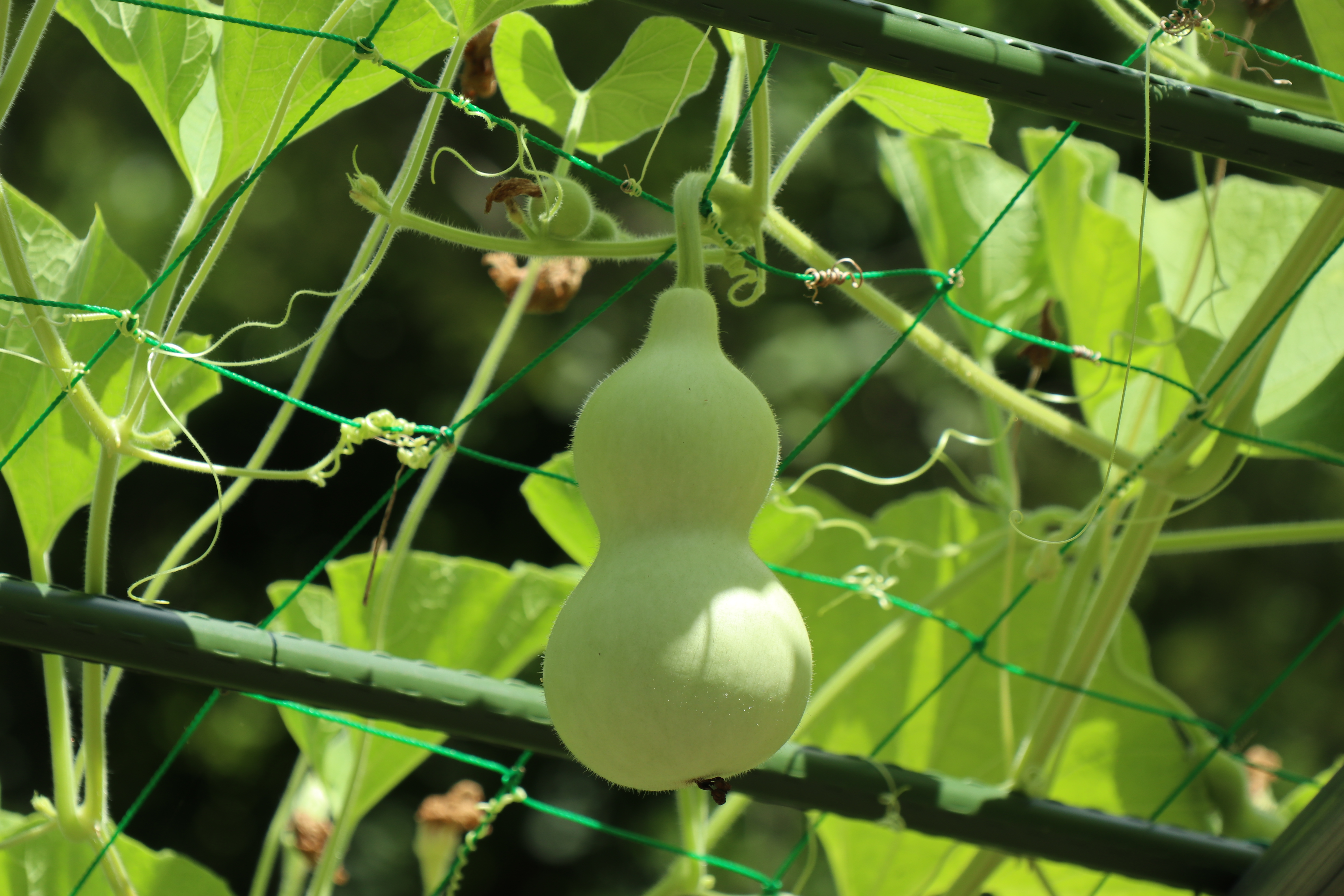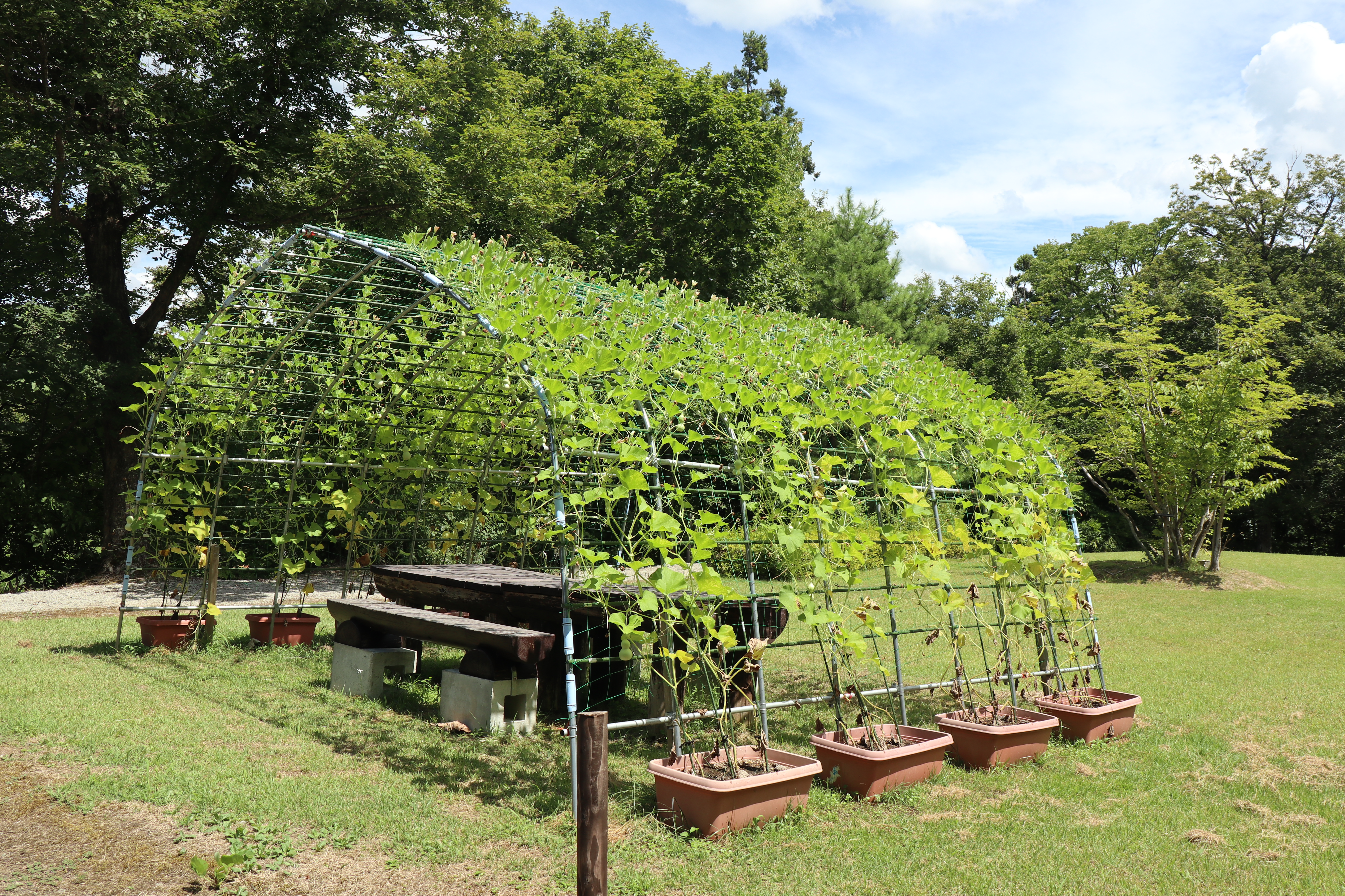 猛暑の「環境と文化のむら」。いつもは涼しい自然ふれあいセンター2階も、さすがに蒸し暑く…と、よく見るときつつきが掘った穴が!アオゲラの仕事?だそうです。ふれあいセンター前のテーブルとベンチには、日陰を作るためにヒョウタンを植えています。今年のヒョウタンは来年の体験教室の材料になる予定です。