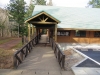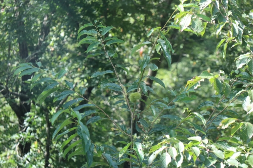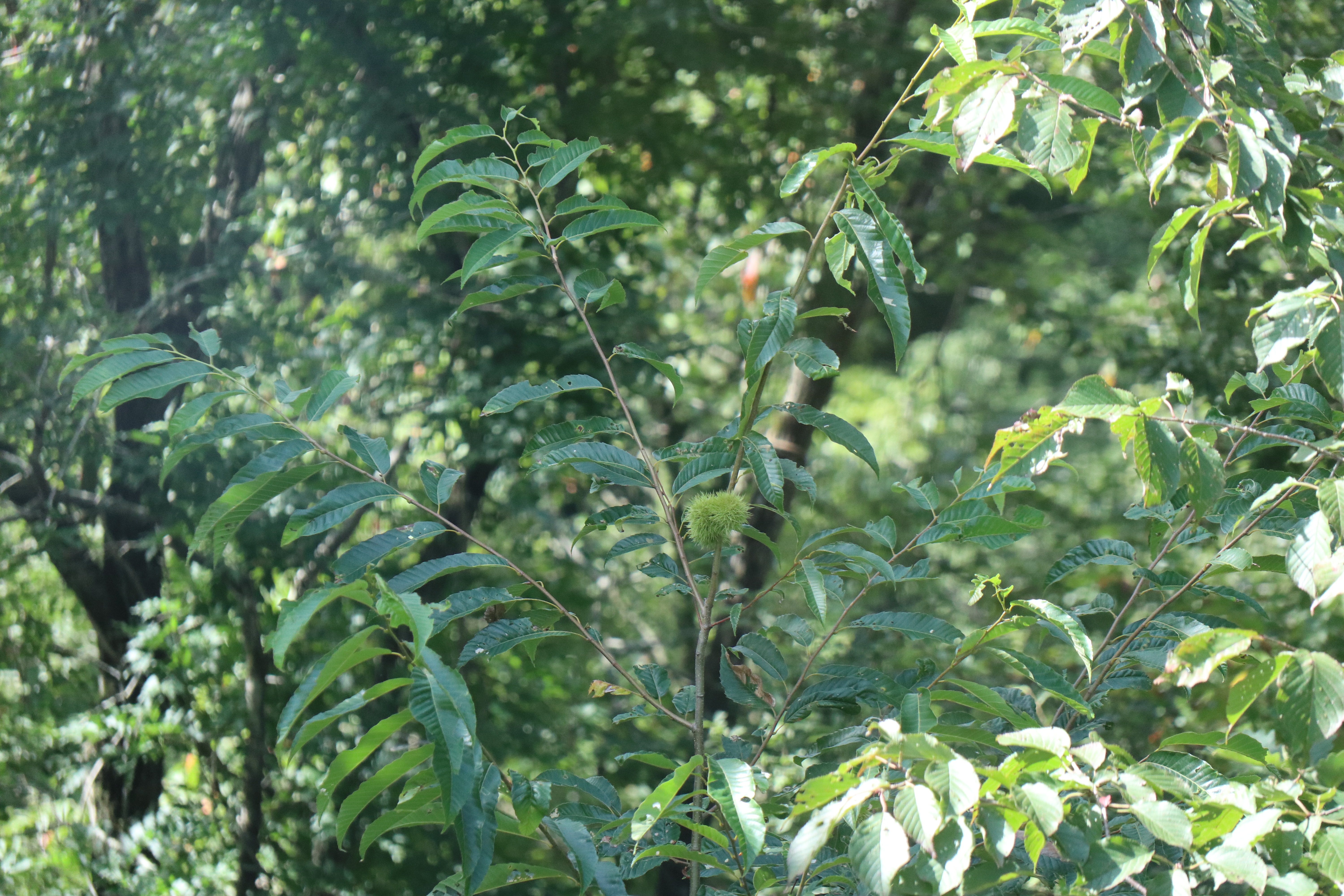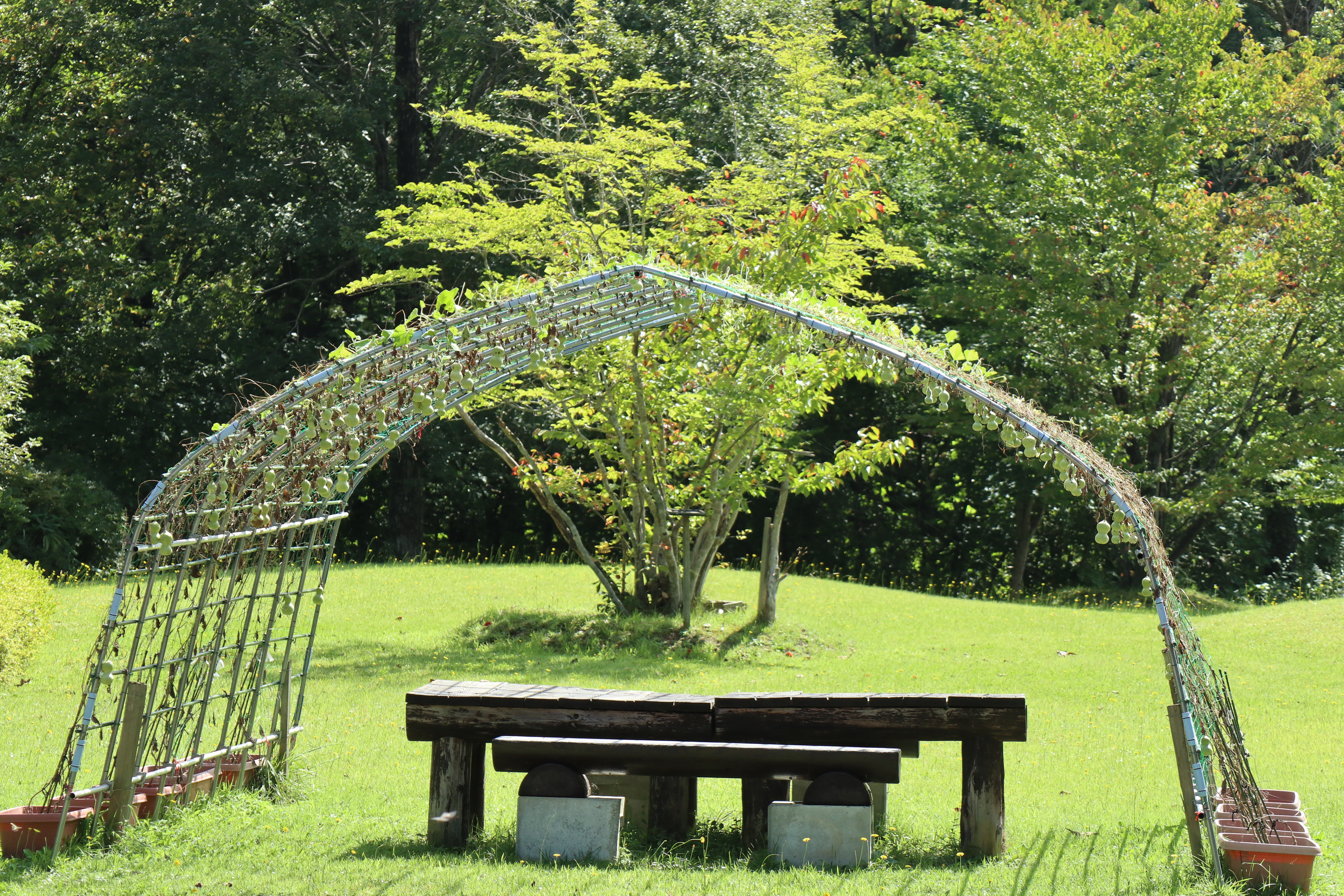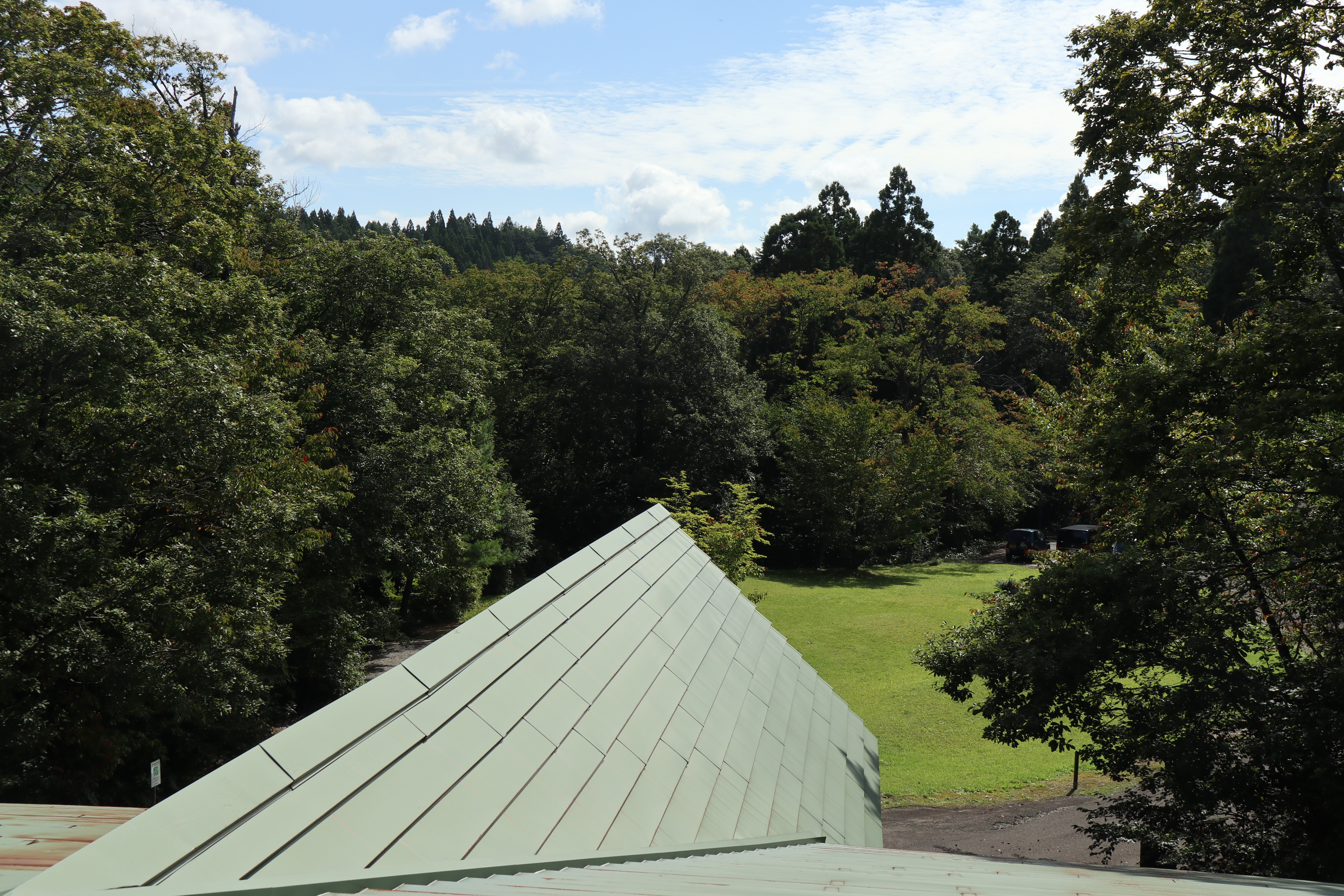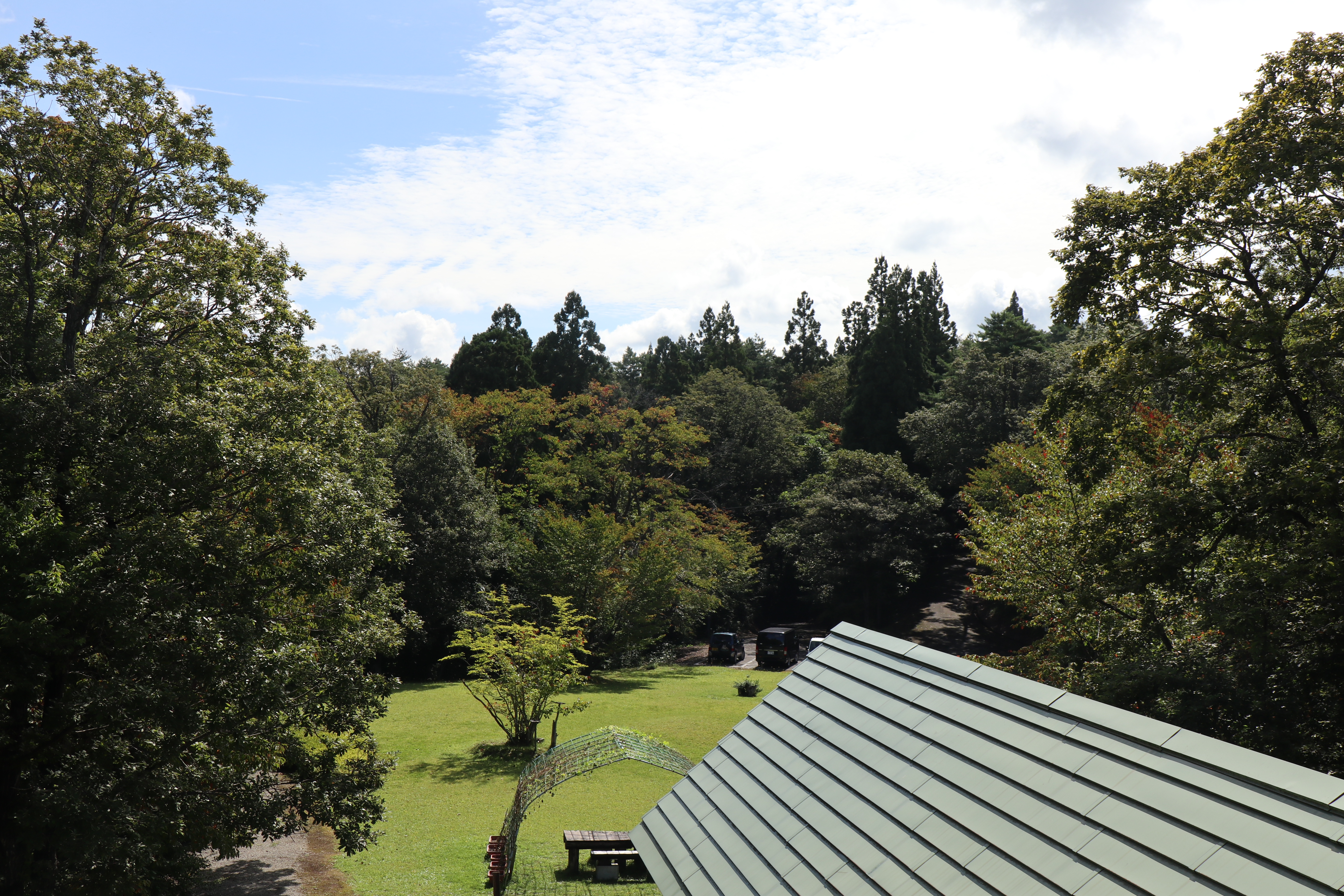 自然ふれあいセンター2階から外を眺めますと、周囲は夏から秋へと姿を変えつつあります。入口の屋根は緑の海に向かう船の舳先のようでもあります。愛鳥山荘ではWi-Fiを使用できますので、散策やワーケーションの際、是非ご利用ください(写真は改修直後)。