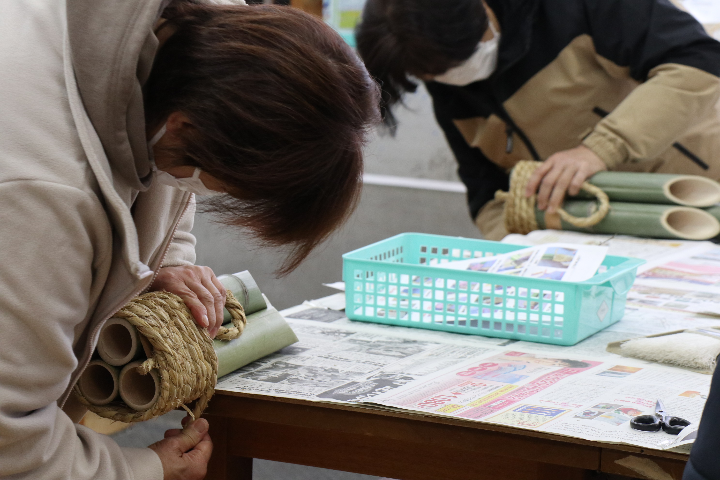 3本の竹をテープで固定し、縄を巻きました。ここまではお隣同士で不安定な竹を押さえ合うなど、助け合い。