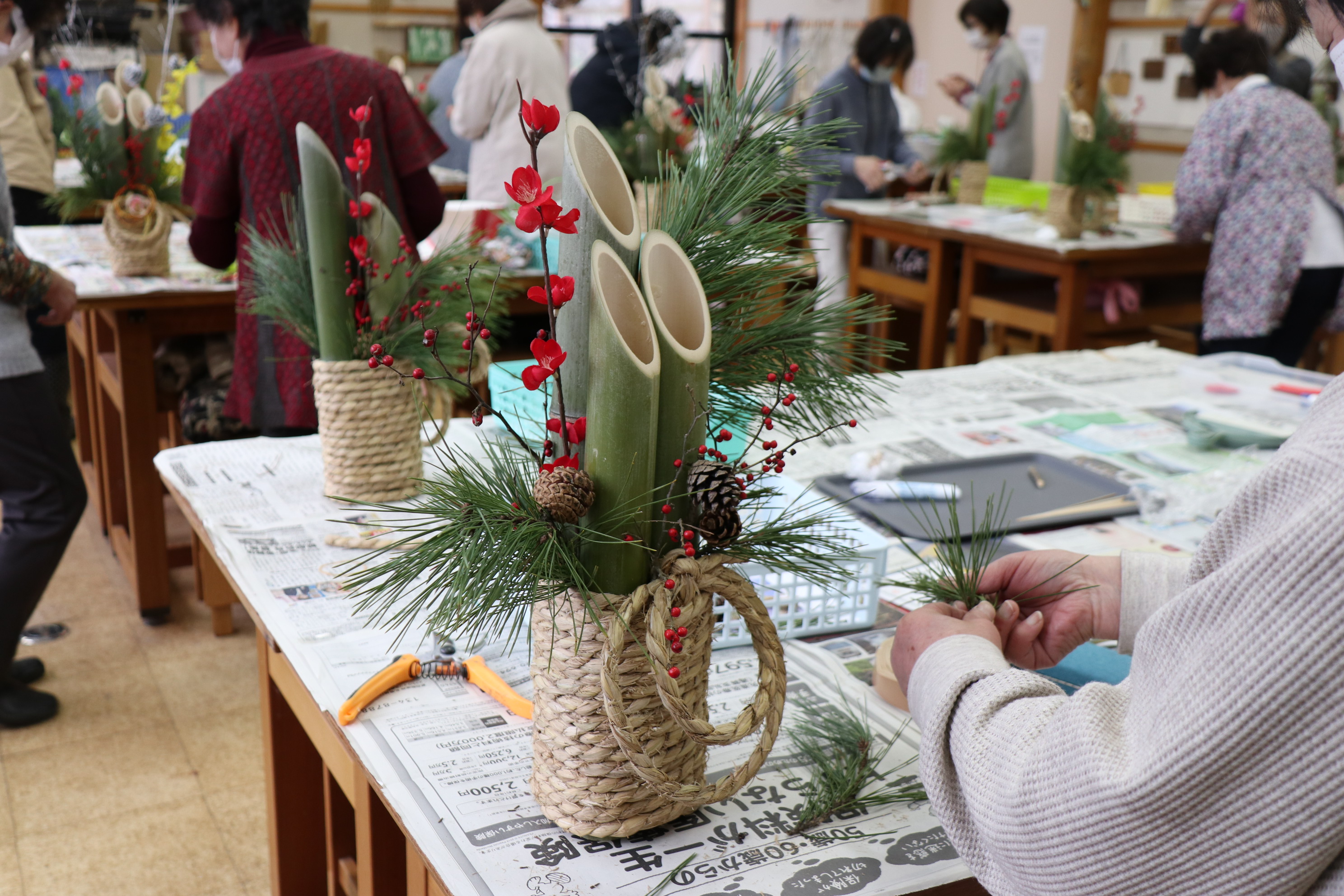 次に松やウメモドキ、造花の梅などで飾り付けました。ここからはみんなで褒め合い。