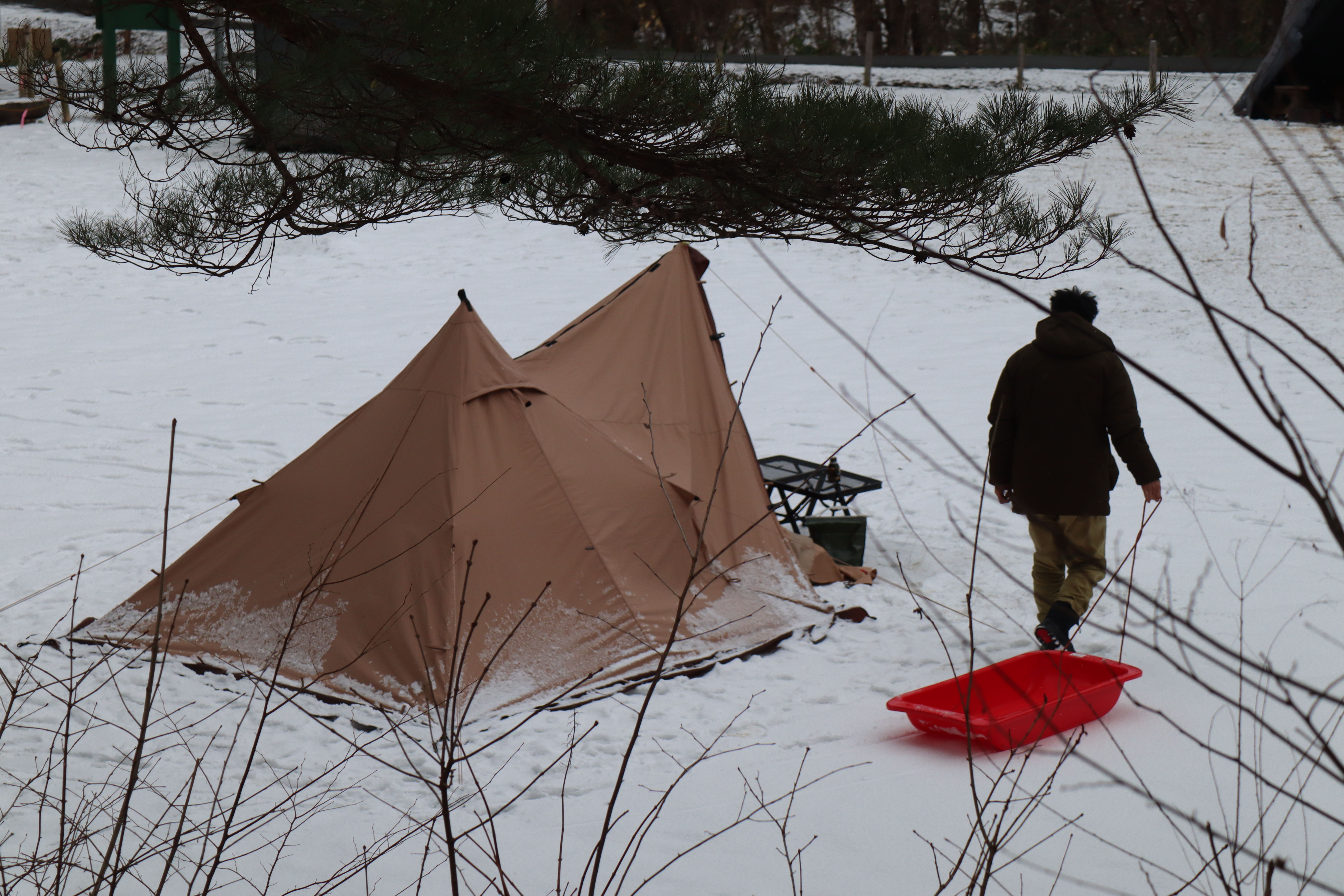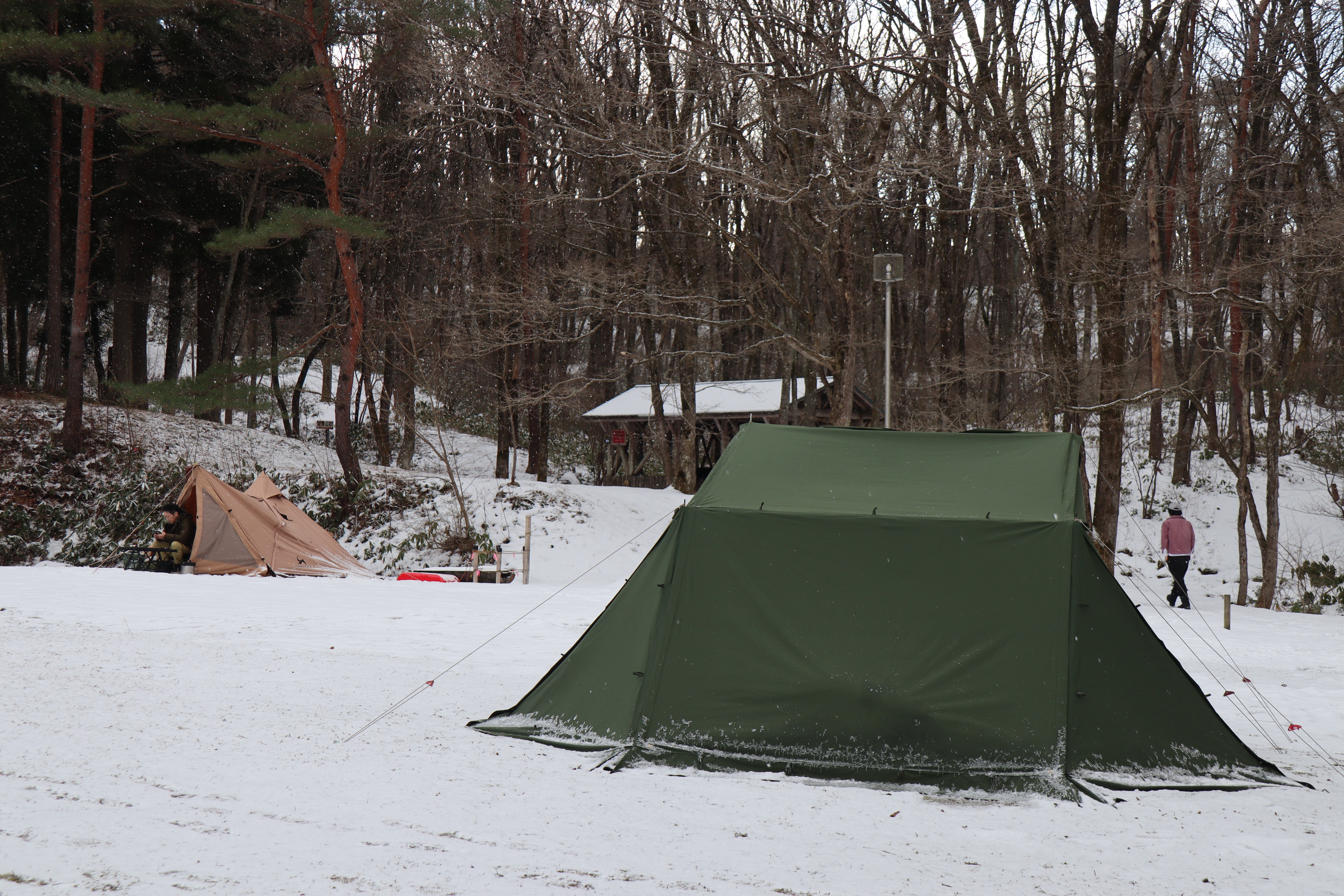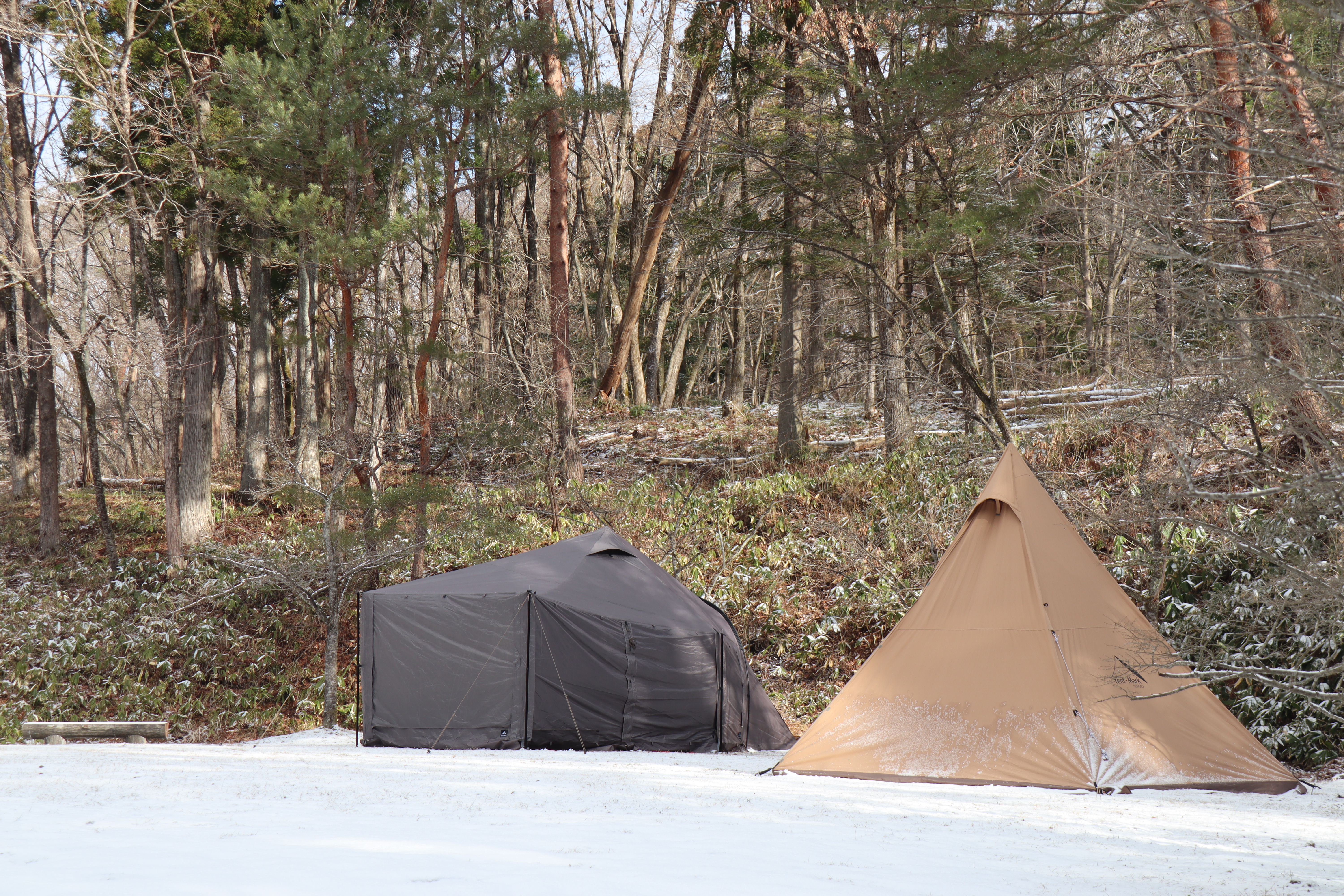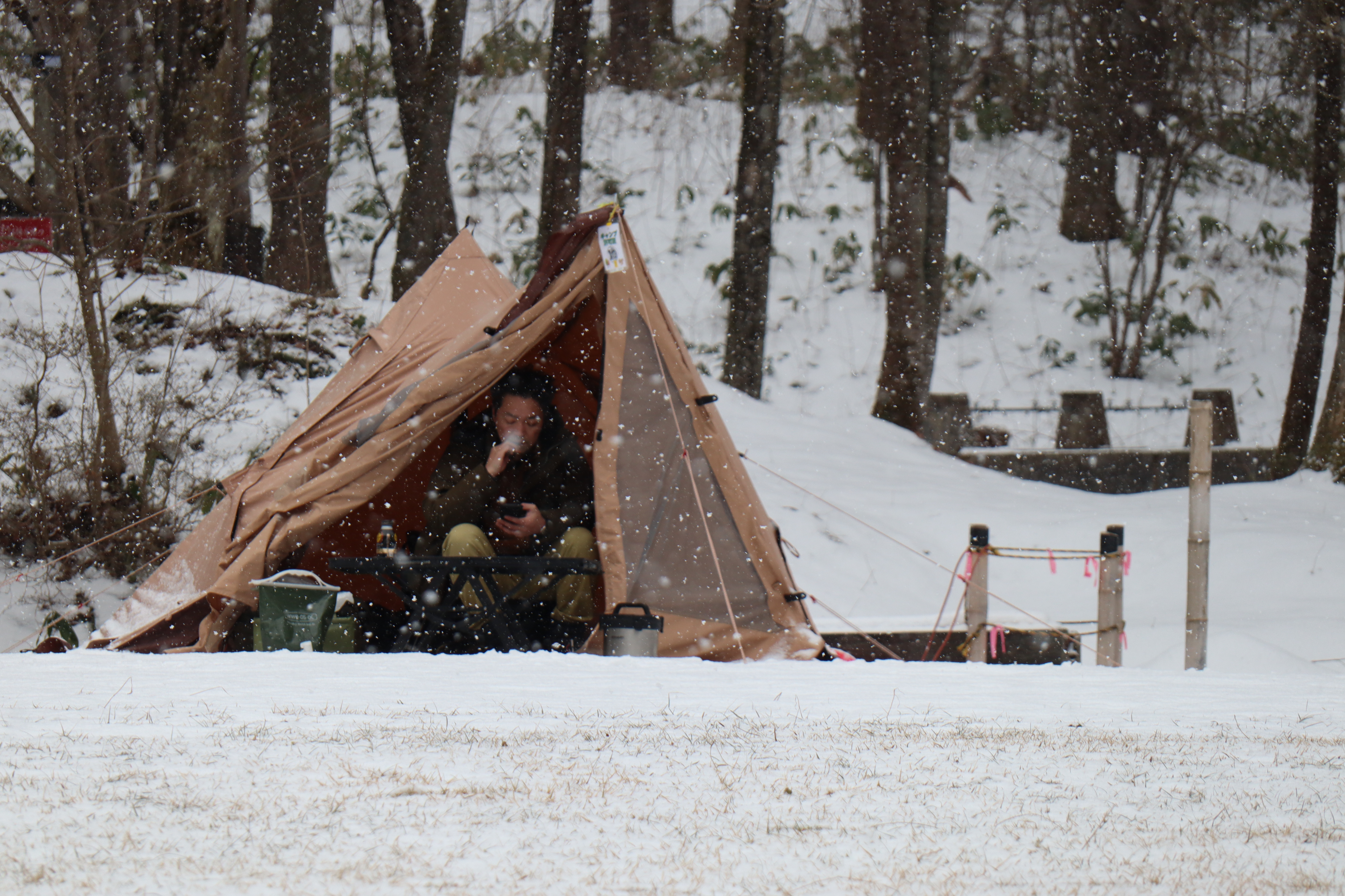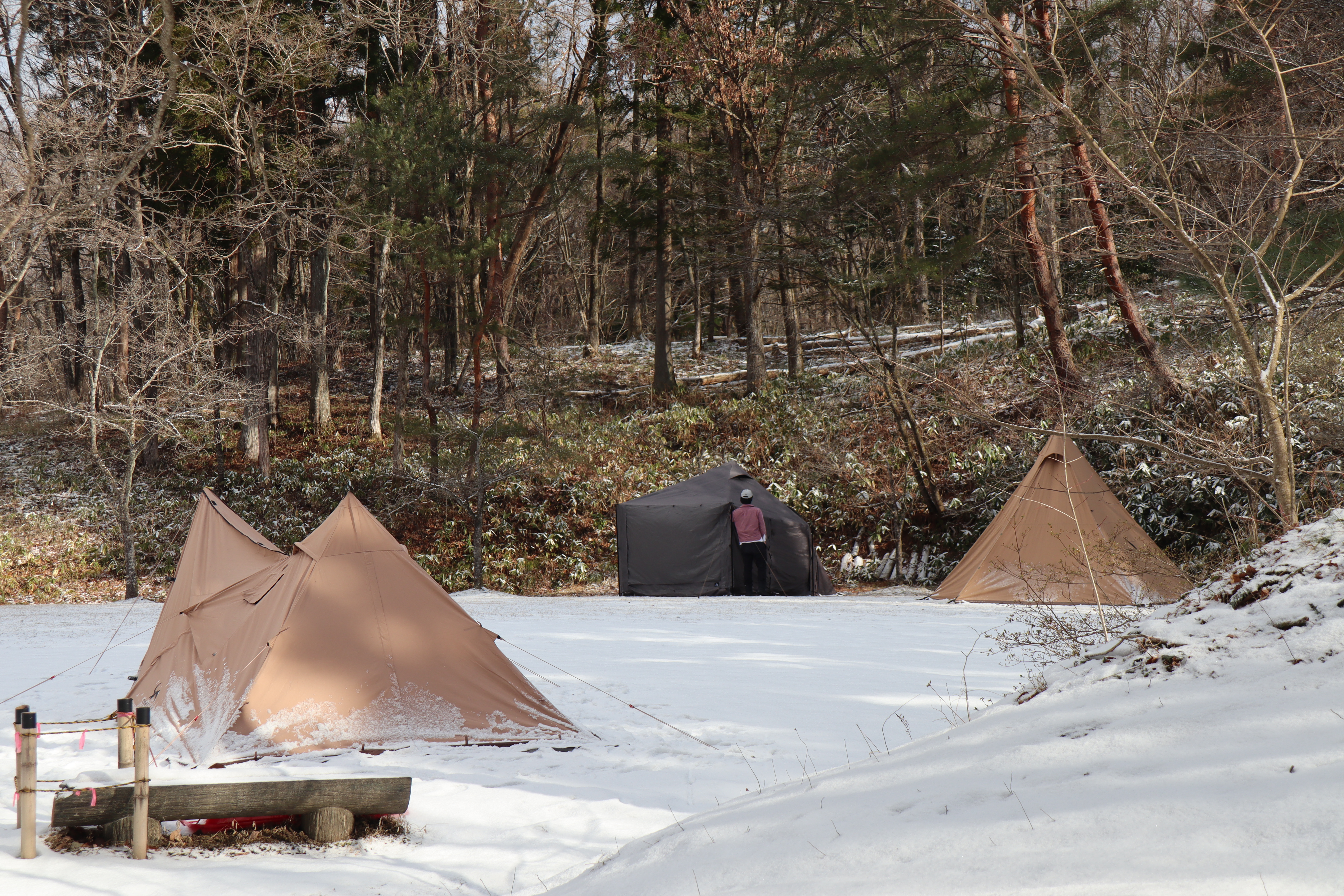 先日キャンプの様子を見に行った時は霜が降りていましたが、今回は雪の中での本格的(?)冬キャンプになっていました。まだ山の中は寒いようです。皆さまお気をつけてキャンプをお楽しみください。
