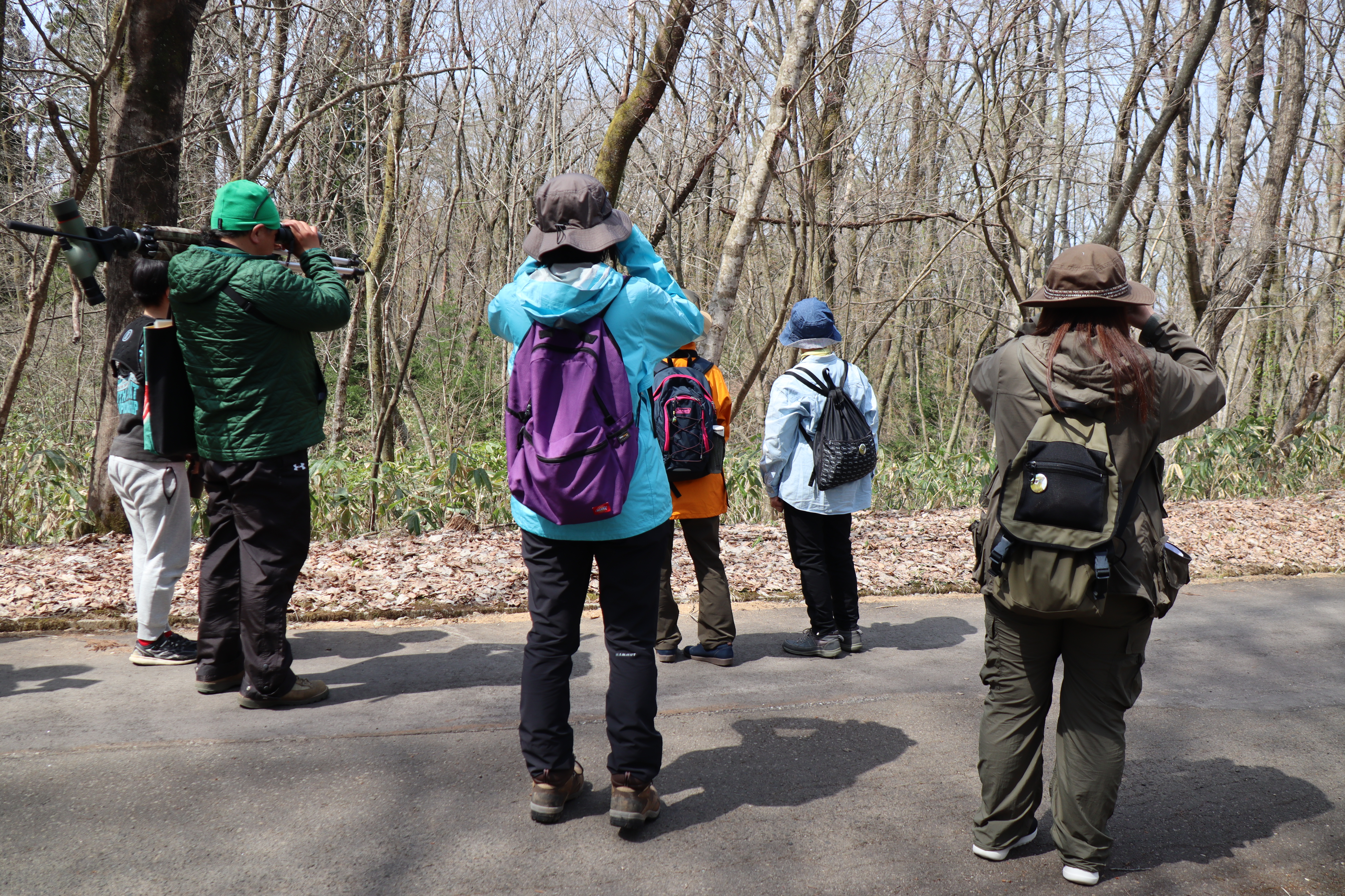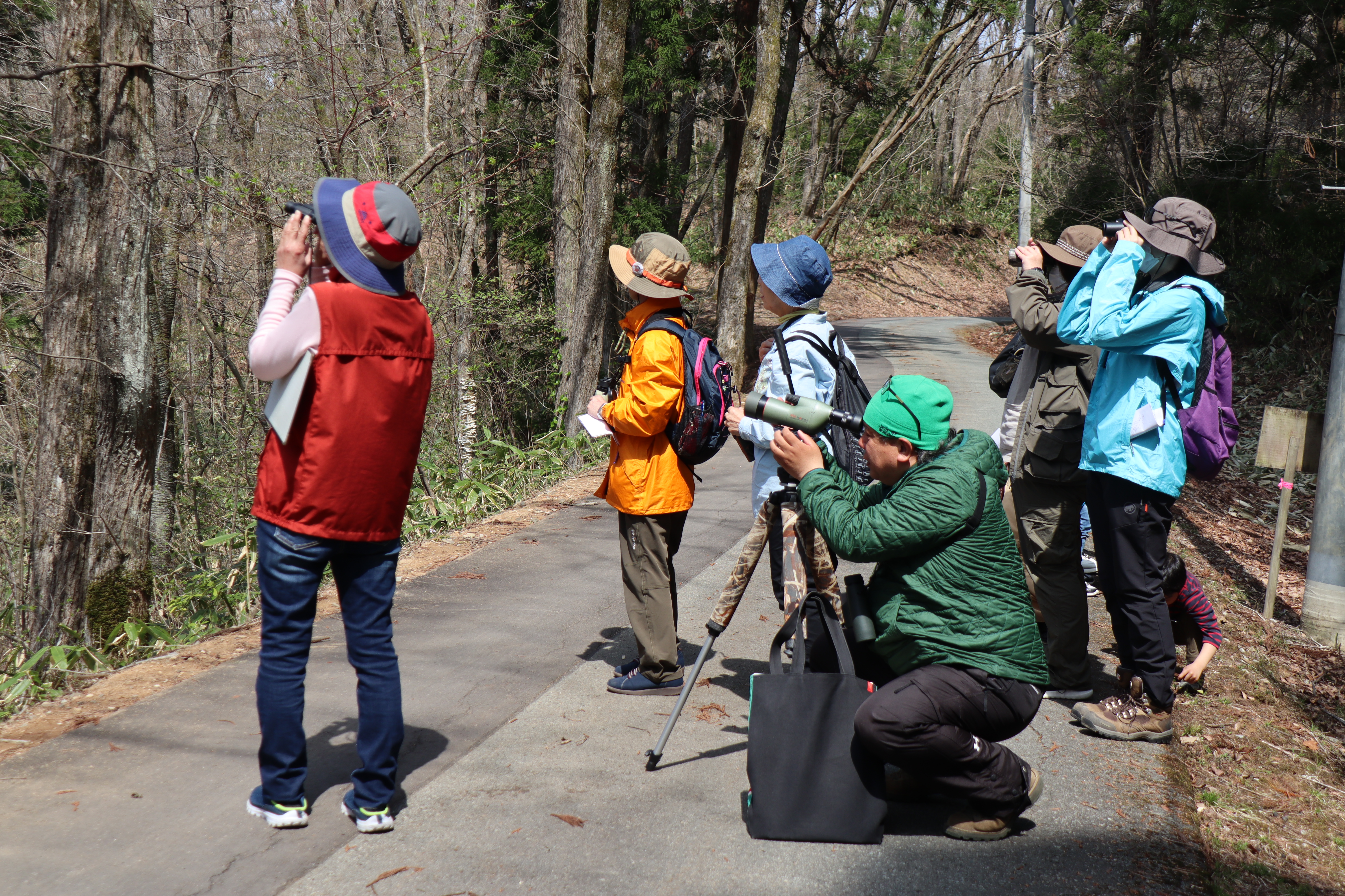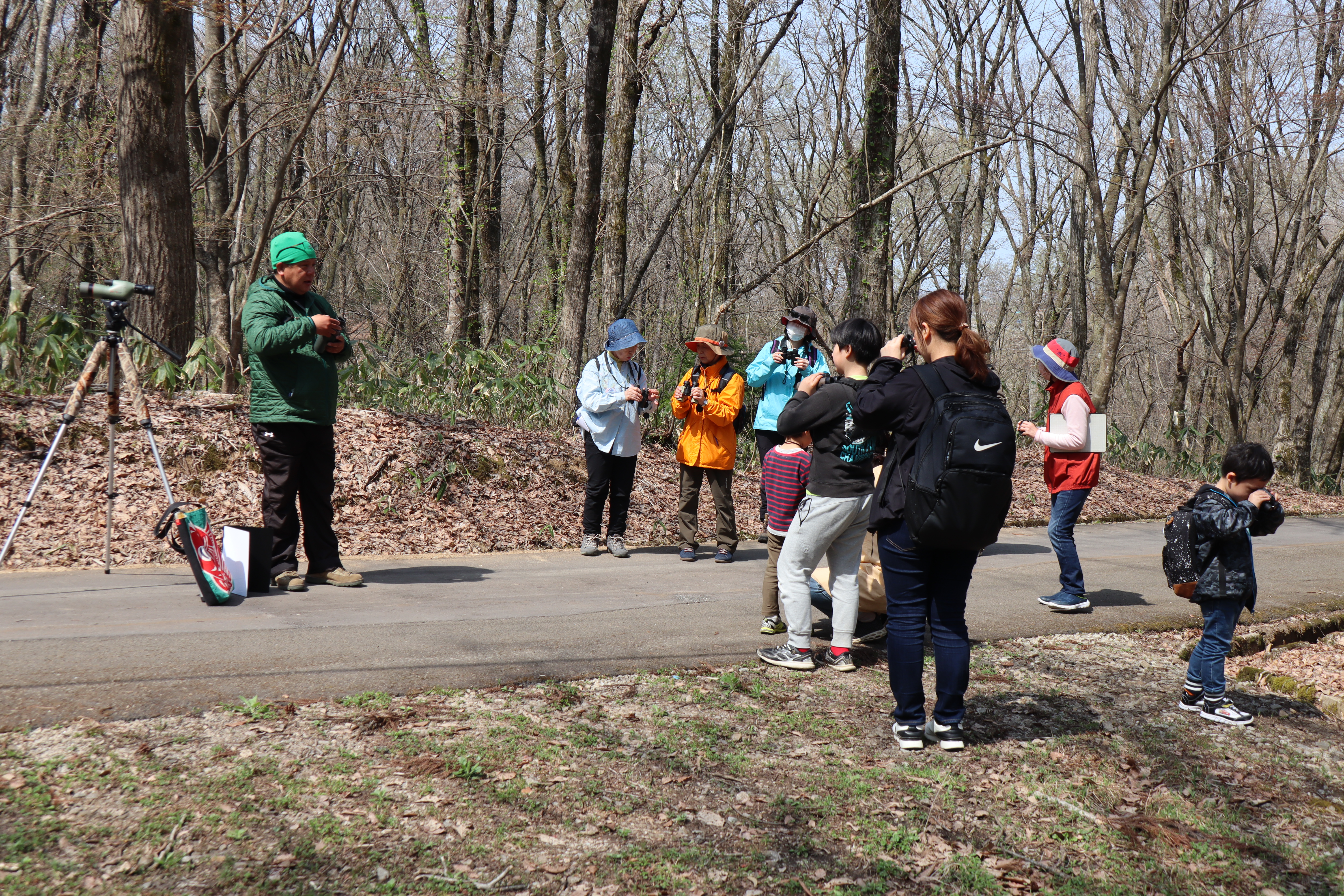 講師は鳥類標識調査員等でご活躍中の足利直哉先生。まず、双眼鏡の扱い方を確認し、野鳥の声で鳥を見つけたり名前を判断したり、飛んでいる鳥を目で追いかけながら双眼鏡をあてて姿を確認したりしました。自然ふれあいセンターに戻って「鳥合わせ」をしましたら、各自が見たり聞いたりした野鳥の数は合計で13種類に及びました。この時期ならではの新緑の芽吹きを感じ、森の新鮮な空気を吸いながら、野鳥を観察する、楽しい体験ができました。
