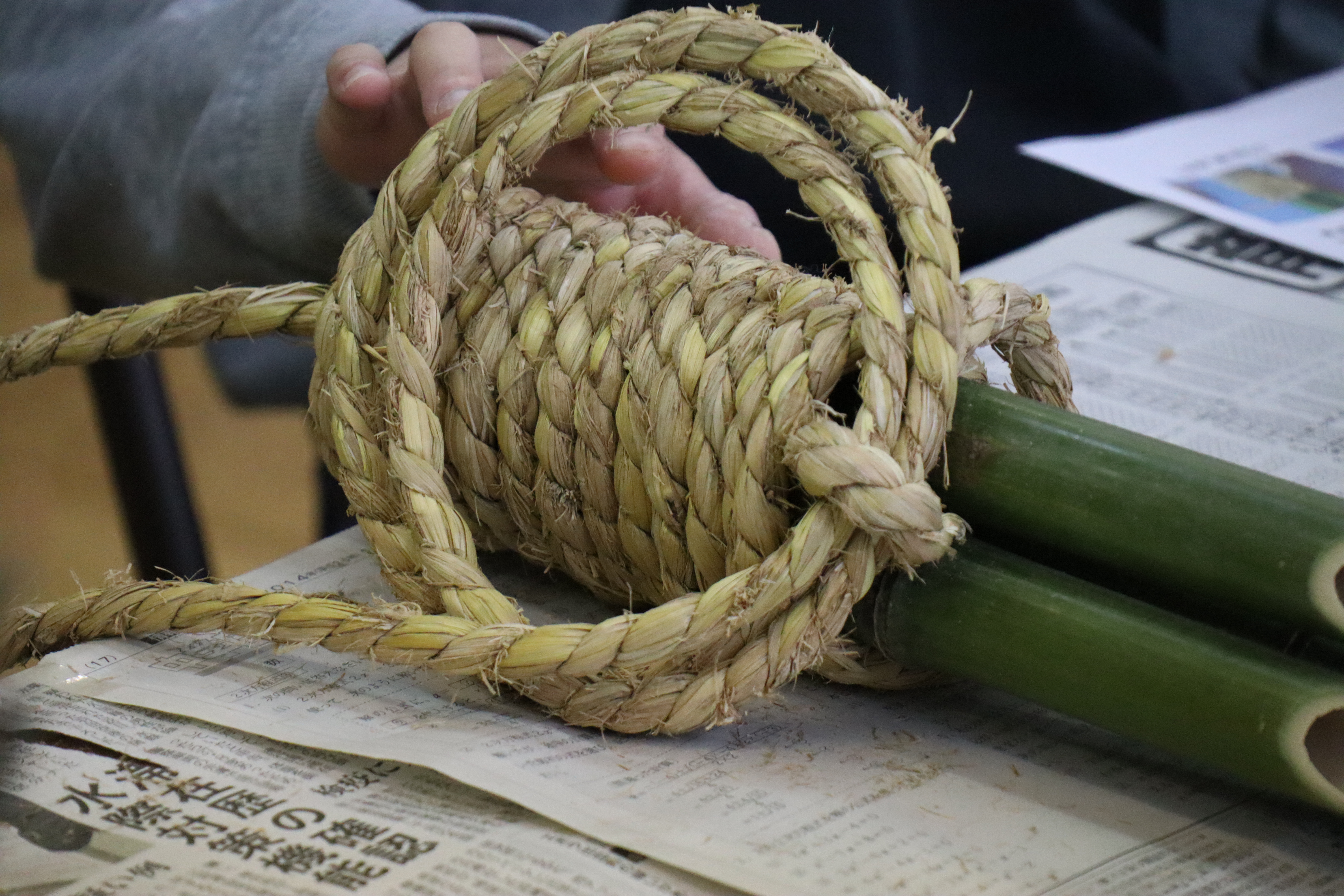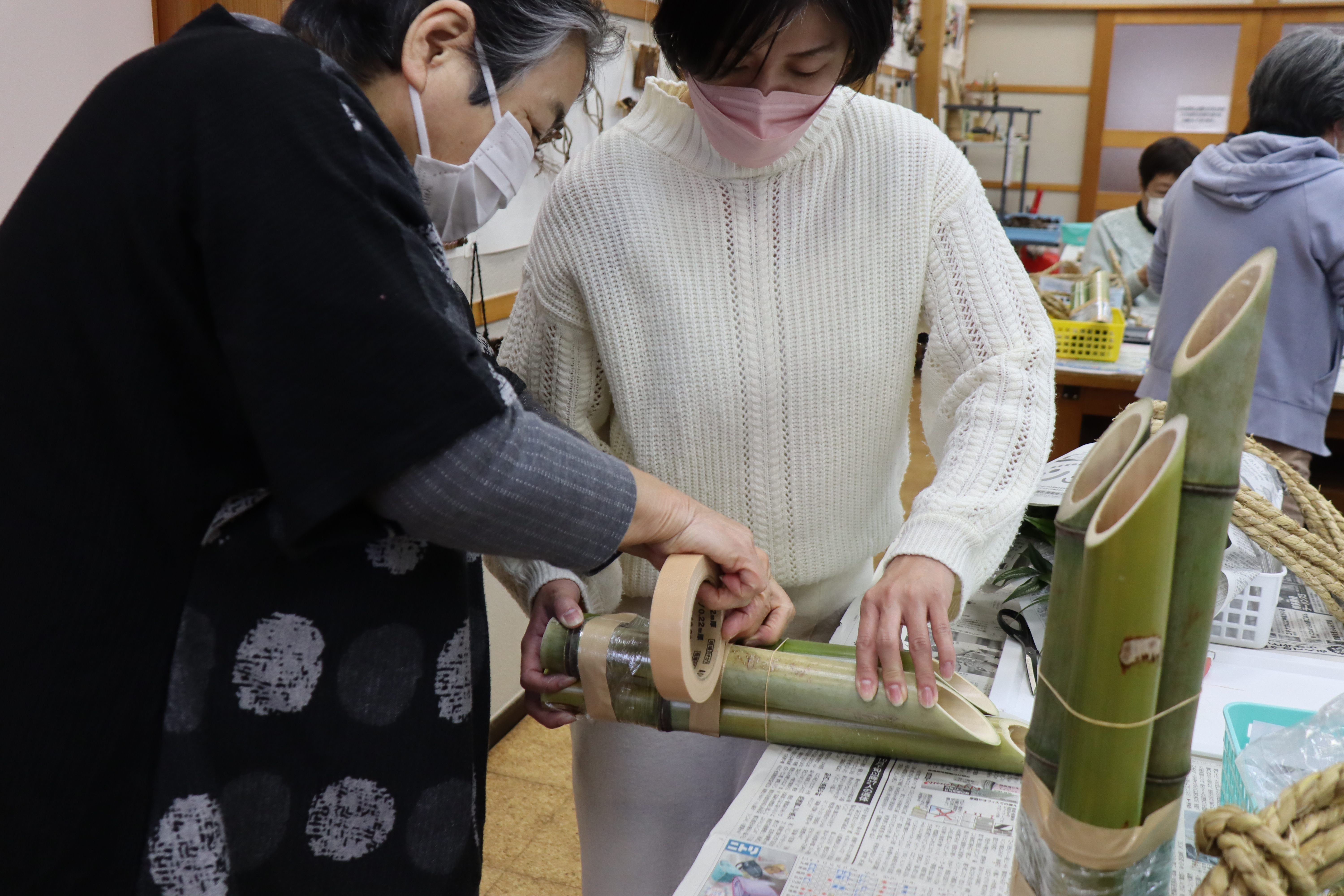 各自選んだタケ3本をテープで固定、ロープを巻き、輪の飾りを作りました。その後、マツ、ウメモドキの赤い実、ウメ(造花)を挿し、折り紙や札を付けて完成させました。お宅からナンテンを持ってきてくださった方もいて、華やかな門松ができあがりました。飾る際のひと手間で一層豪華に見えることも学び、皆さん笑顔でお持ち帰りになりました。新年に向けて、また一歩前進しましたね!
