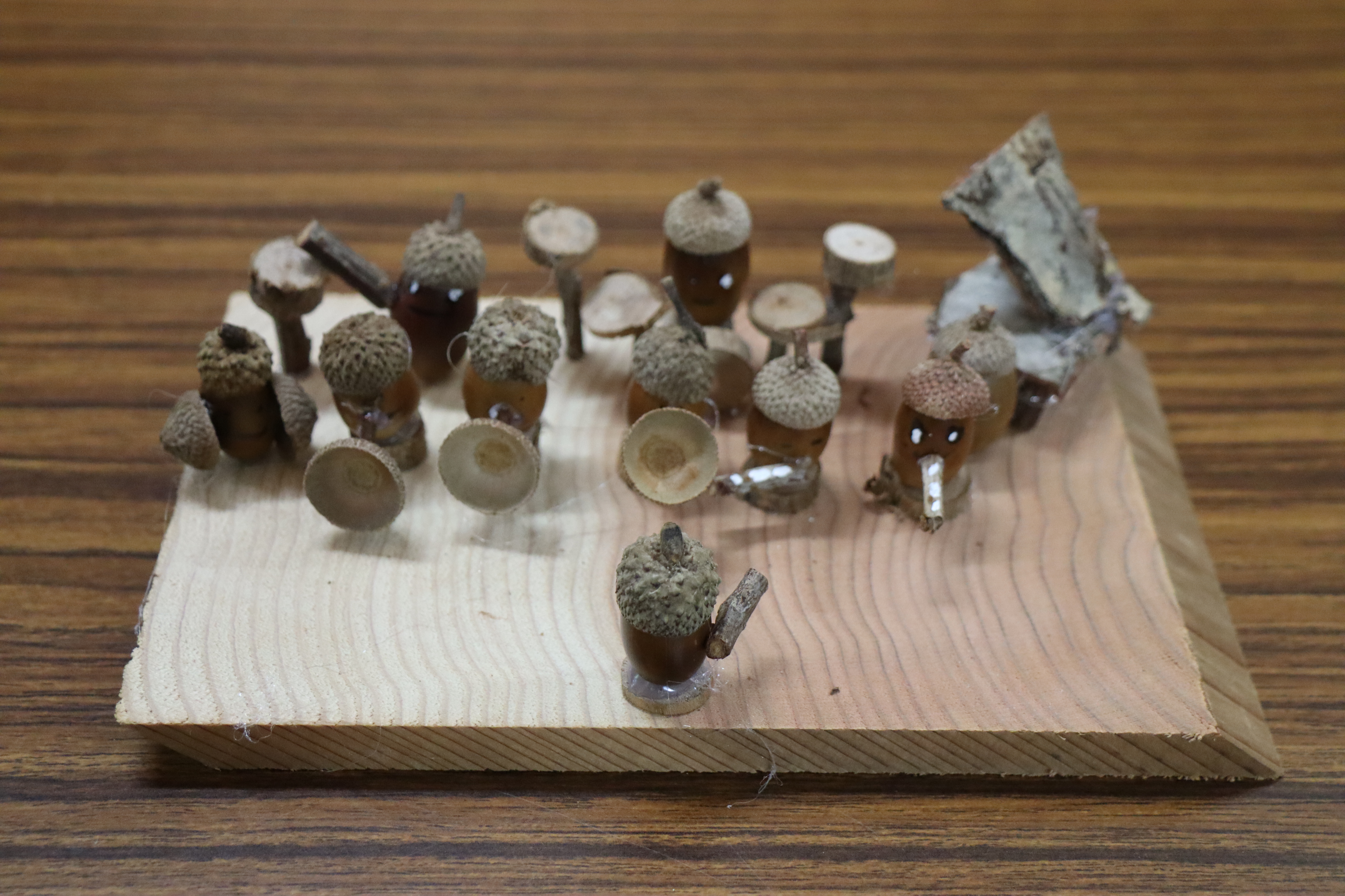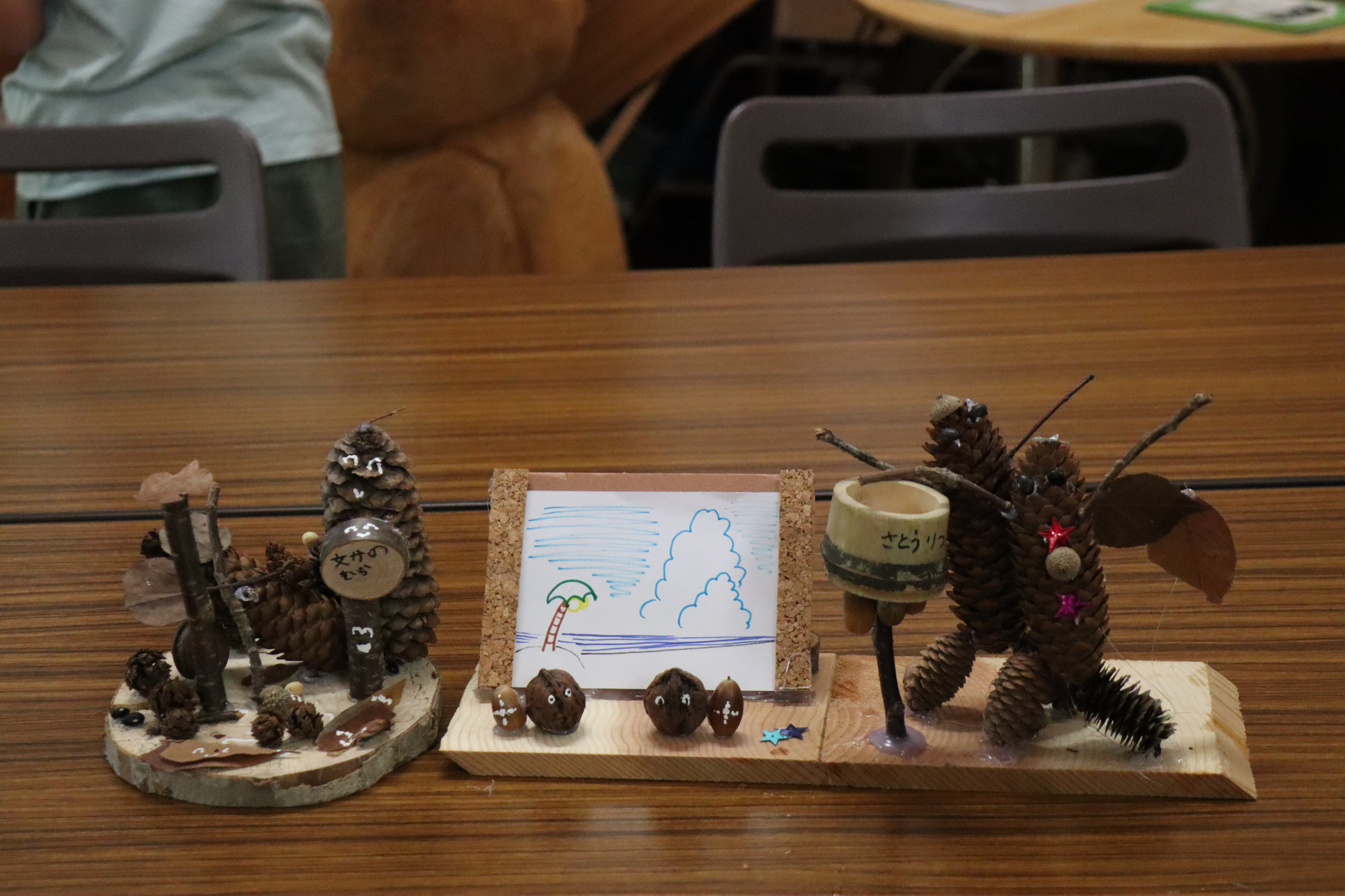 主にグルーガンの使い方、注意点などの説明の後、環境と文化のむらの敷地内で採取された自然素材を使い、各自思い思いの作品を作りました。
